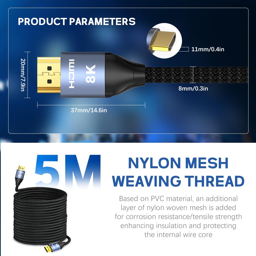 Verilux 8K HDMI Cable Ultra HD HDMI 2.1 Cable Support 8K60hz 4K120hz HDMI to HDMI Cable 16.4ft/5m Nylon Braided HDMI Cable Universal HDMI Cable for TV, Monitor, PS3/PS4, Projector