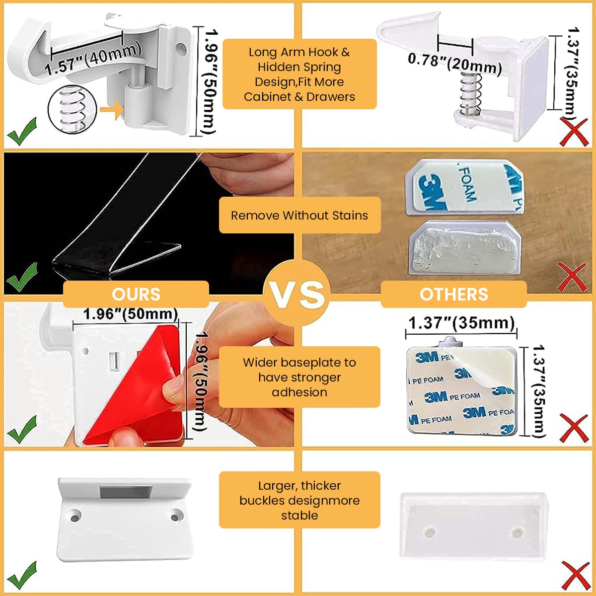 - UPGRADE INVISIBLE DRAWER LOCK: This cabinet locks for babies consists of one barrier part and one spring hook, the barrier part is used for attaching the spring hook, and the spring hook works as a hand to grip the barrier so the interlock happened by the barrier and spring hook will prevent the fully opening of drawer . The internal installation of this safety drawer lock can allow the drawer be opened within safe gap, enhancing the home safety at home for kiddos.