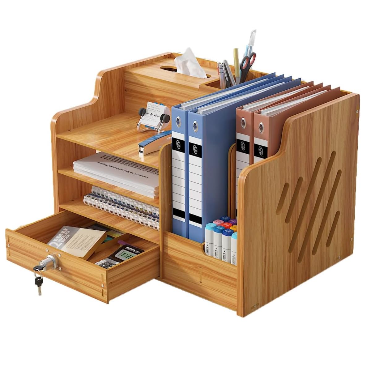 Climberty Wooden Desk Organizer is a multifunctional desktop organizer set designed for efficient and tidy workspace management. Made from premium cherry wood, this sturdy and durable organizer features a smooth surface and stable construction with easy slot-based assembly. Its well-structured compartments include a book stand, pen holder, tissue holder, and a four-layer storage rack, providing convenient space for office supplies and daily items. The organizer also includes a drawer with a lock, ensuring secure storage of personal belongings. Measuring approximately 38.3 x 29 x 28 cm, the Climberty Wooden Desk Organizer offers practical organization for offices, reading rooms, and kids’ study areas, reflecting reliable craftsmanship and thoughtful design.