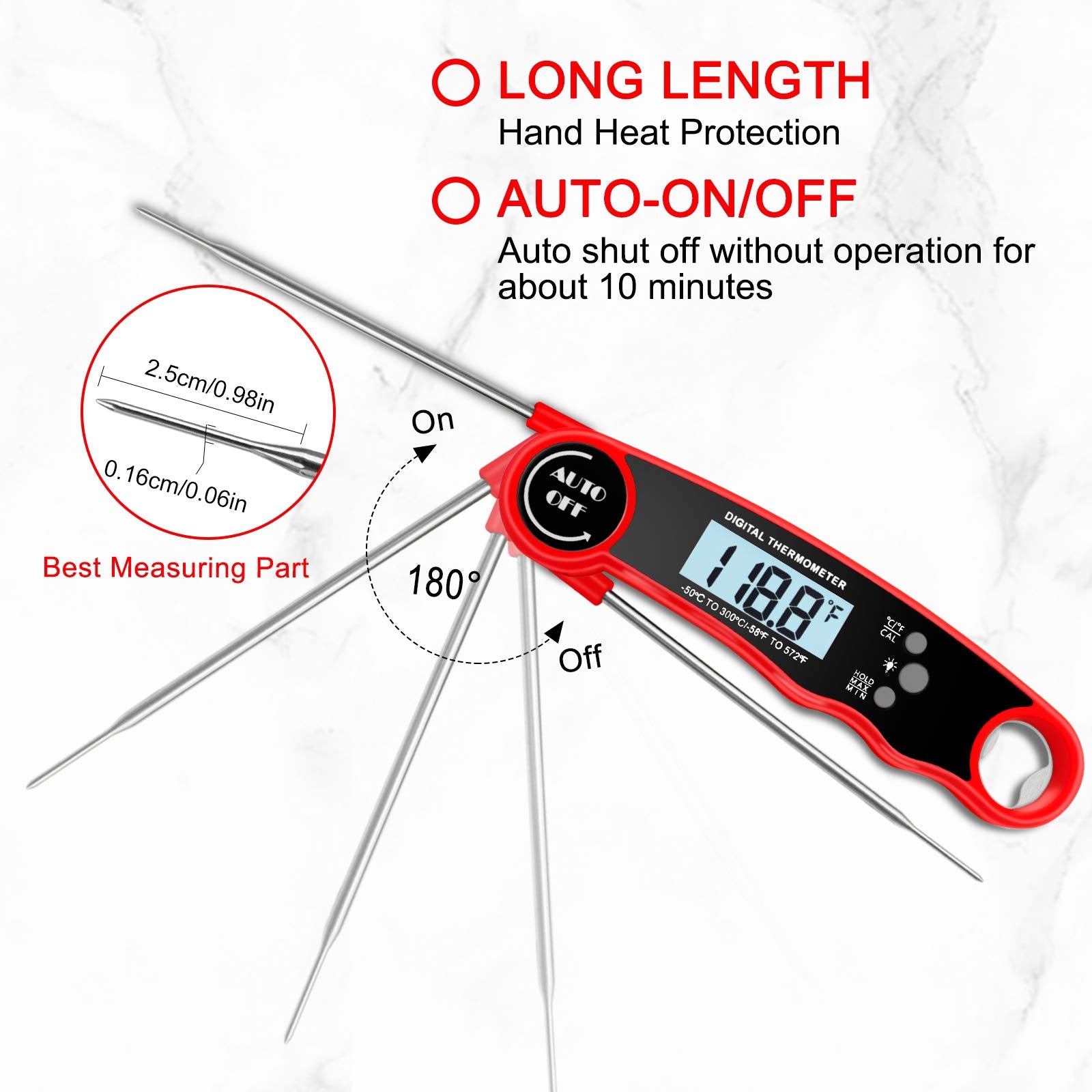 - ?[Easy To Use] : Just insert the long probe into your food / liquid, the digital thermometer will show the temperature quickly. And the folding design make it auto turn off in 10 seconds. Celsius & Fahrenheit switchable is the most convenient feature of the thermometer, you can change them easily by pressing ?C/?F switch.