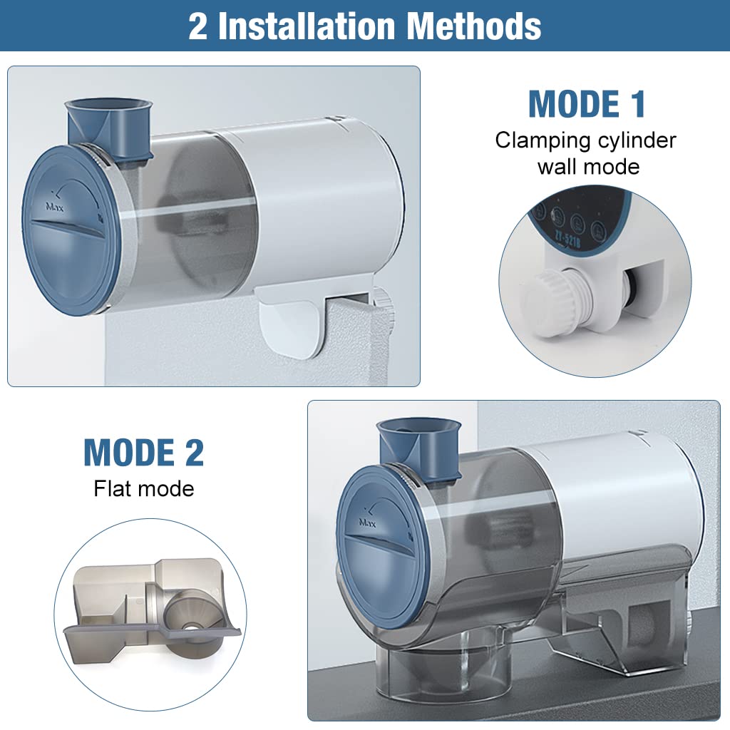 - EASY TO INSTALL: The fish feeder has 2 install methods for you to choose. One is to fix the fish feeder to the fish tank wall by using the holder. Another is to place the feeder on the top of the fish tank .