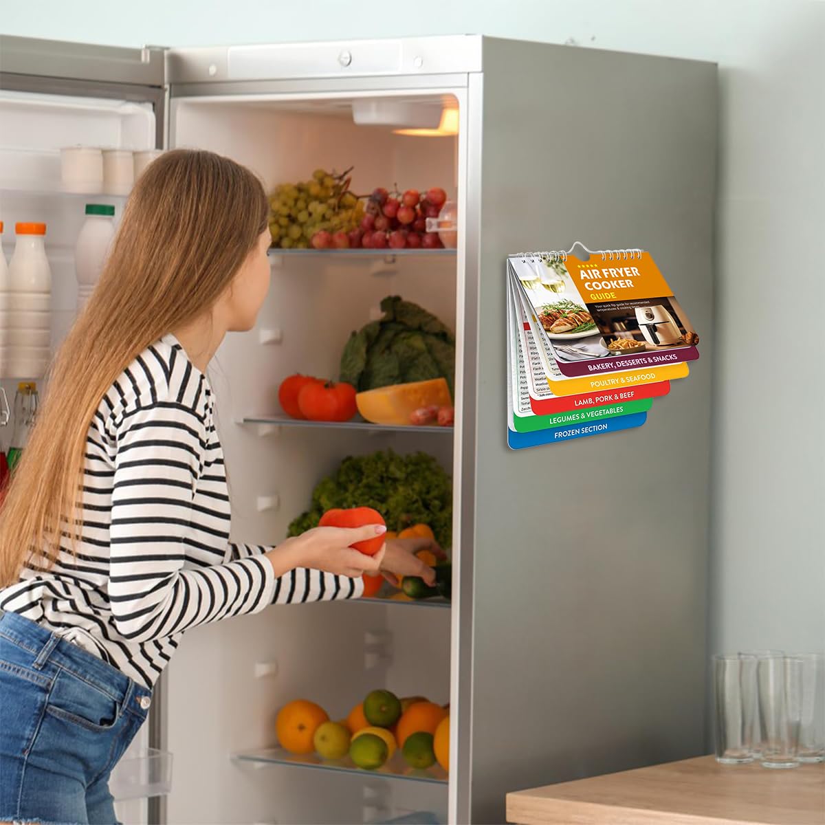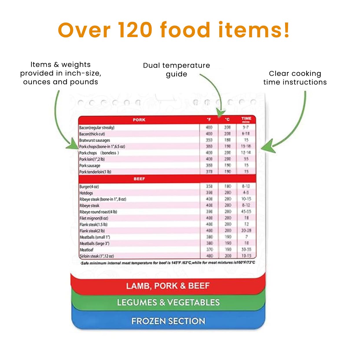 - COOKING MADE SIMPLE: This magnetic cheat sheet set for your air fryer provides meticulously detailed cook times for a vast array of foods, from baked goods and desserts to meats and vegetables. Master the art of perfect texture and taste for every meal, every time.