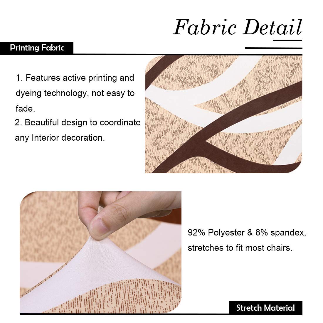 - PERFECT CHAIR COVER: Dining chair slipcovers are made of 92% polyester and 8% spandex. Fabrics ensure that the chair covers are elastic and easy to install. Soft and smooth, you can still sit comfortably on the chair with the cover. Will not wrinkle and fade, always keep your dining chair looking good.