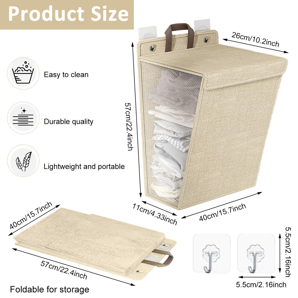 HANNEA Laundry Basket with Lid Wall Laundry Basket with Hanging Eyelets Breathable Linen Mesh Fabric Upright Dirty Cloth Hamper Portable Laundry Bin with Handle, 41x15x58cm