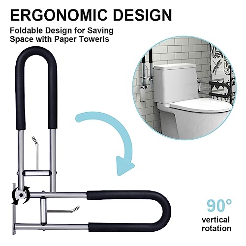 - PRACTICAL HANGING HOOK DESIGN: The folding handrail for toilet features a hanging hook that can be used to hold a toilet paper roll, towel, or other supplies. This handrail with hook enables people to easily access the necessary toiletries while using the toilet. The handrail can also be used to hold onto while having a shower or bath, making it a dual-purpose support for the user.