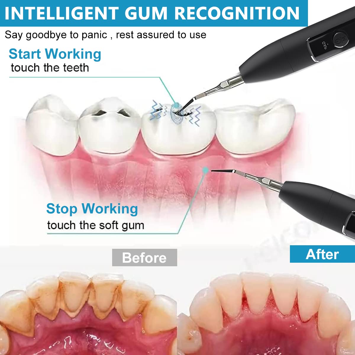- THREE WORKING MODE WITH SAFETY PROTECTION: 3 cleaning modes, one button to switch modes, gentle mode/ comfort mode/strong mode(specially design for massive plaque), meet different people's teeth situation and cleaning needs. Each cleaning mode is with preset working mode, you can adjust different mode as your oral situation. Also with smart sensor, once the bit is off the tough plaque or touch the soft gum, it will stop automatically, ensuring safe operation.
