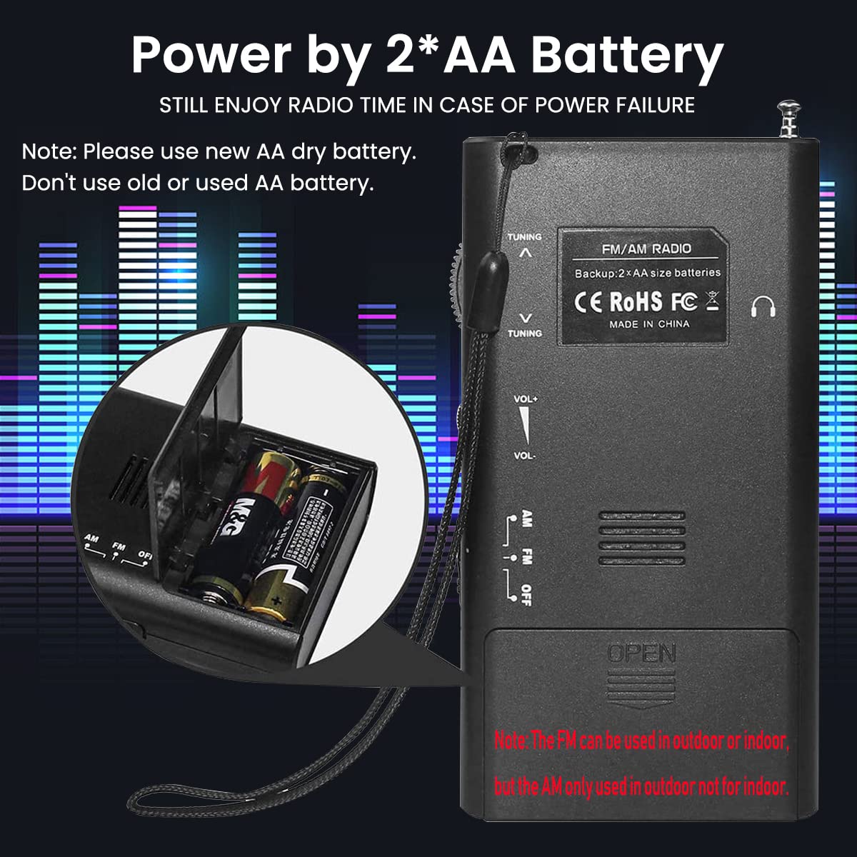 - BATTERY POWERED AND LONG LASTING PERFORMANCE: No worry of power outrage with a rechargeable FM radio, this AM FM radio is powered by 2*AA battery(not included). Using your devices throughout the day eats up batteries in a few hours time. With our AM/FM radio, your AA batteries will last for weeks. No matter indoor or outdoor, this battery operated am fm radio can brings you more fun and enjoyment. Note: The FM can be used in outdoor or indoor, but the AM only used in outdoor not for indoor.