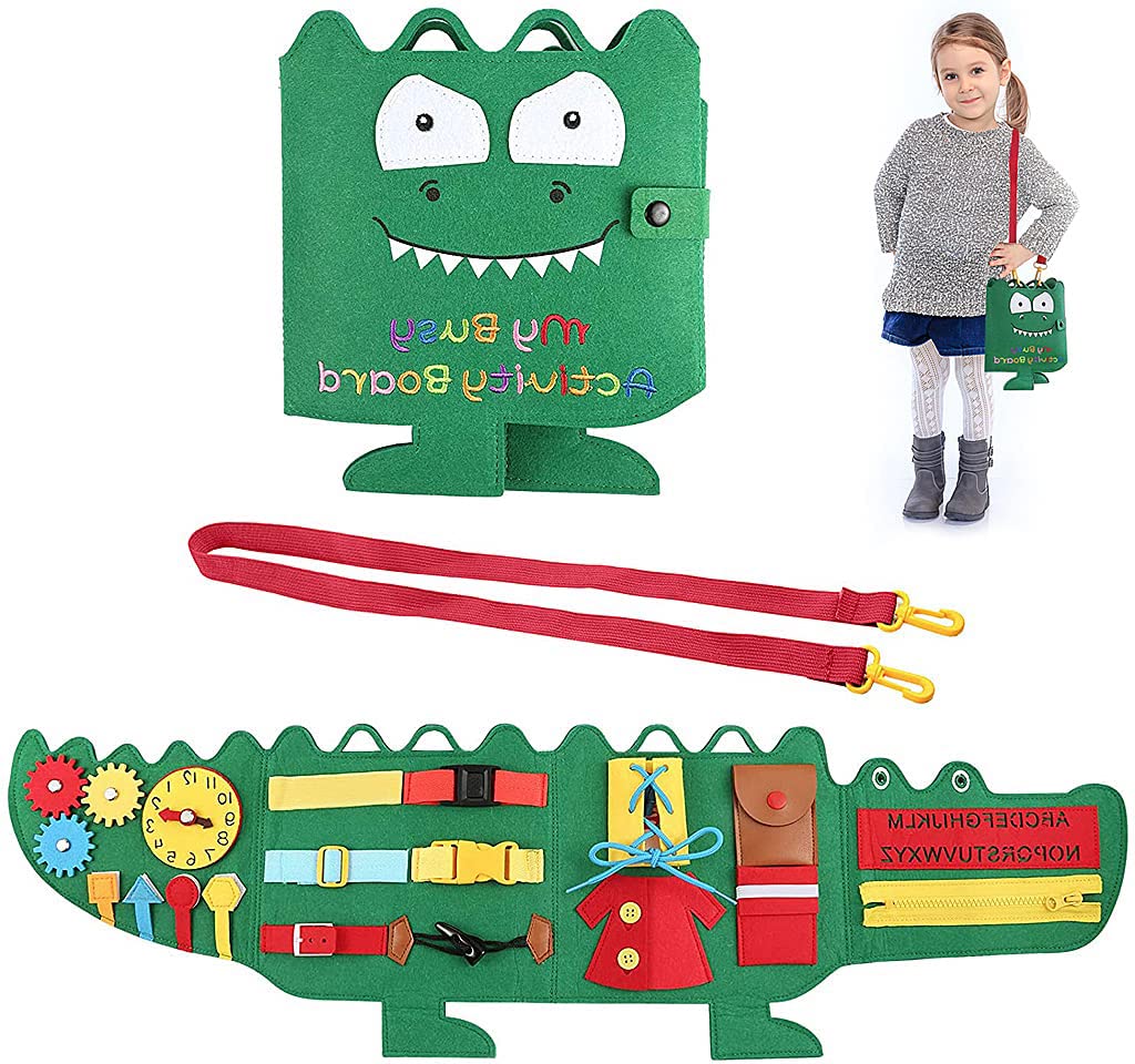HASTHIP Montessori Cartoon Crocodile Educational Toddler Busy Board Toy helps young children develop essential learning and dressing skills through hands-on play. Made following Montessori principles, this sensory toy encourages toddlers to practice zipping, buttoning, and buckling, fostering hand-eye coordination and fine motor development. Its colorful design and functional elements make it ideal for early education and parent-child interaction. Lightweight and resembling a handbag, it is easy to carry during travel by car or airplane. Recommended for supervised play for children over three years old, this HASTHIP busy board provides a safe, interactive way for toddlers to build confidence and independence while learning practical life skills.