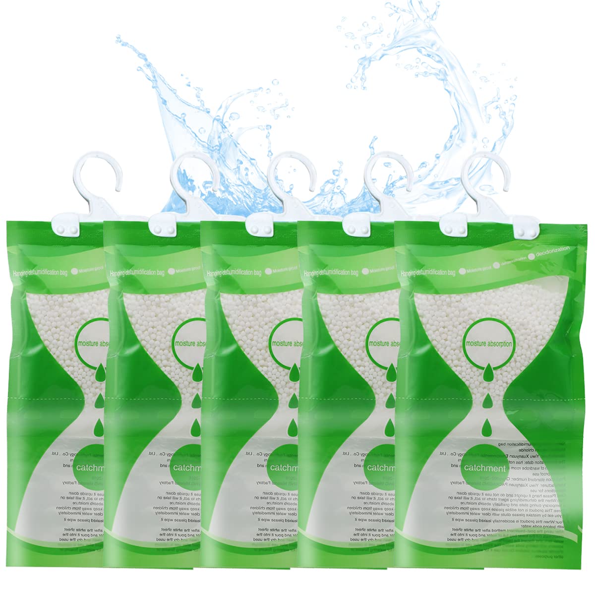 HASTHIP 5 Pack Moisture Absorbers are hanging humidity packs designed for effectively absorbing excess moisture in closets and enclosed spaces. Each dehumidifier bag contains 160g of calcium chloride that can absorb up to 400ml of water, helping to prevent dampness and odors in clothing and stored items. The transparent bag design allows users to see the collected water, while the one-way permeable paper ensures safe and leak-free use. Featuring a convenient hanging hook, these moisture absorbers are easy to place in wardrobes, bathrooms, basements, or RVs. With linen fragrance and long-lasting physical dehumidification, HASTHIP offers a dependable, eco-friendly way to protect your home from humidity and musty smells.