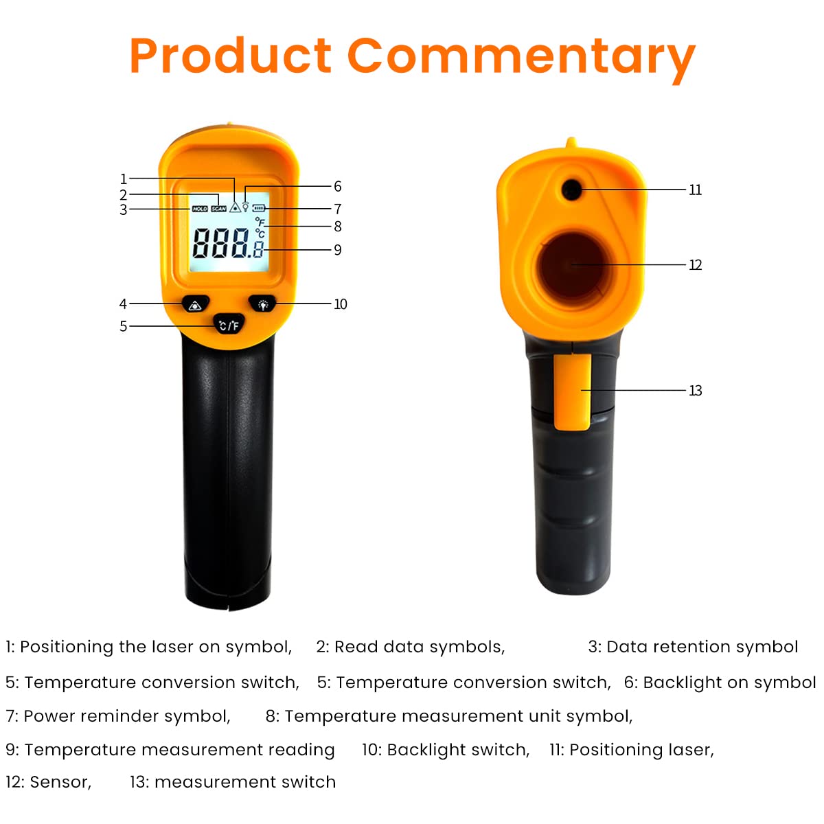 - HD LCD DISPLAY: Digital temperature meter has clear user interface, The LCD screen with backlight can distinguish the data at a glance, you can easily read temperatures in the dark. You can easily set the temperature you desire and you can set switch the unit between Fahrenheit/Celsius as you prefer. Laser thermometer also has an auto-off function and low battery indicator to extend the battery life.