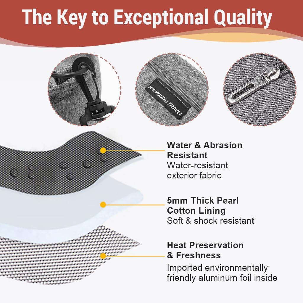 - INTERIOR INSULATION AND WATERPROOF LAYER: The bag's interior is lined with a premium insulation and waterproof layer. This combination maintains your food at the desired temperaturewhether hot or coldwhile preventing leaks and spills. It's perfect for keeping your meals fresh throughout the day, making it an indispensable companion for school or work.