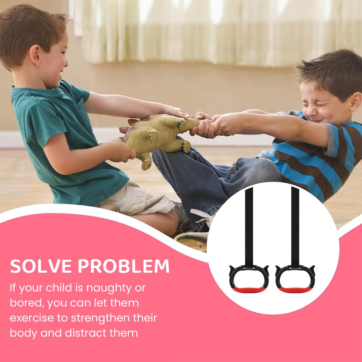 - ADJUSTABLE GYMNASTIC RINGS FOR KIDS: This gymnastic ring for kids features an adjustable design that caters to their specific needs. The included 3.3ft long nylon webbing strap allows for easy adjustments, ensuring the perfect height for their comfort and safety. The loading capacity can be upto 360Lbs, ensures kids safety.