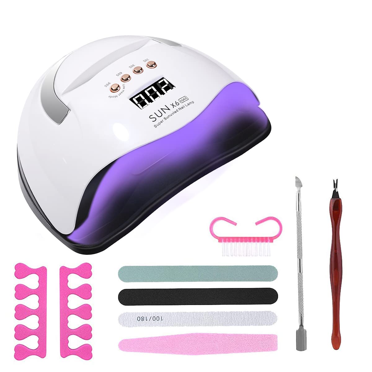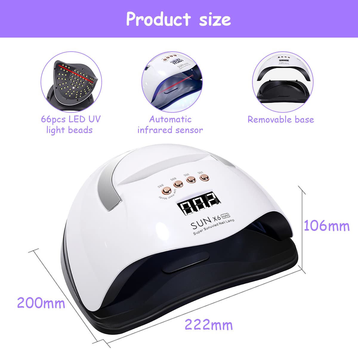 - SMART INDUCTION LED GEL NAIL LAMP:More convenient and efficient nail lamp for nail art lover to enjoy professional nail salon at home.280W large power with 66pcs LED UV light beads. Dual wavelengths 370nm and 400nm provides a quick and safe nail polish drying. Built in infrared induction can auto on or off according whether detect your finger,more convenient and energy efficient. Enough space for fully finger spreading, both suitable for fingernail and toenail.