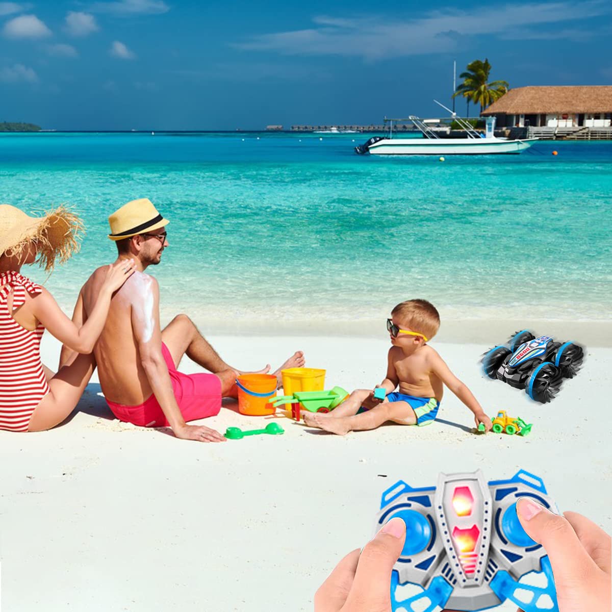 - LAND WATER 2 IN 1 REMOTE CONTROL CAR: Amphibious remote control car is equipped with a waterproof rubber ring to protect inner accessory of the car which makes it possible to drive smoothly on the water. It's a fun land & water rc car for boys 5+ years. Four-wheel drive design supports it can break through land, sandy beach, mud, grass or sea easily! Playing fun together with parents and kids!
