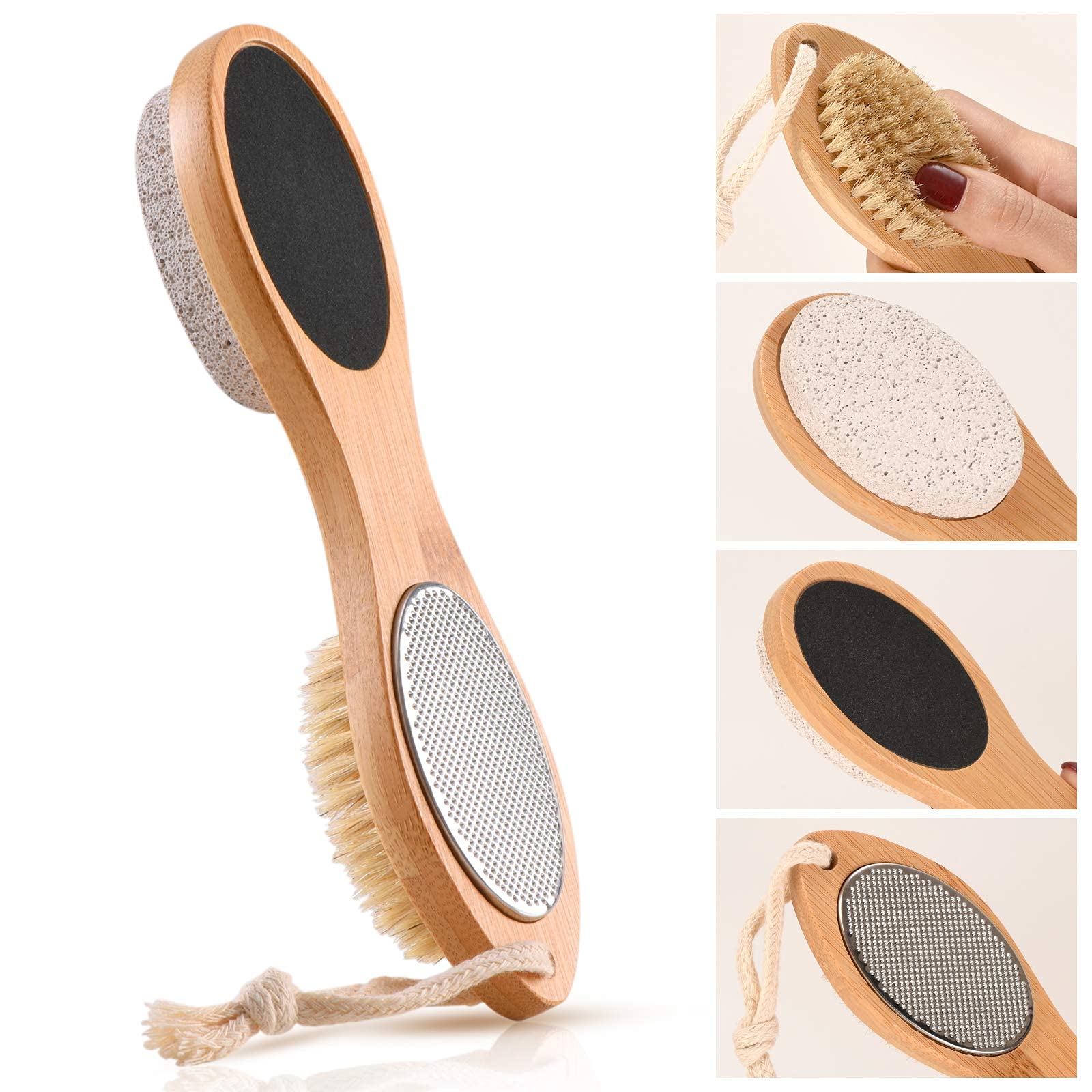 - Multi-functional: 4 in 1 Foot file callus remover foot scrubber, which's formed by bamboo, pumice stone, sand and steel file piece; A good piece of equipment for healthy foot care, it fit in with many of the other utensils in the shower.
