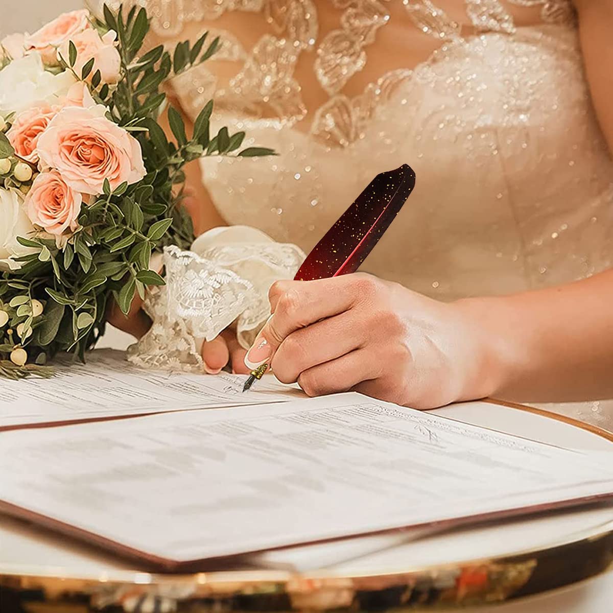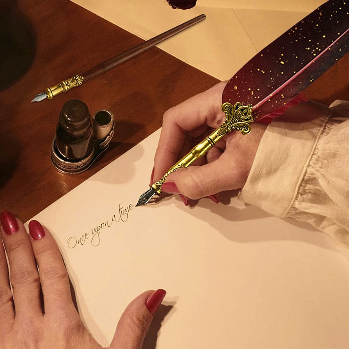 - EXQUISTE CRAFTMENT AND DETAILS: Practical quill pen can be used for daily writing or a signature pen or practicing your calligraphy. And except the practical function, another amazing part is the details and design on the whole pack, carved rose on the vintage metal texture nib; luxurious artificial feathers; engraved elegant glass diamond seal stamp, etc, all the exquisite details make it more than a set of stationery but a piece of art.