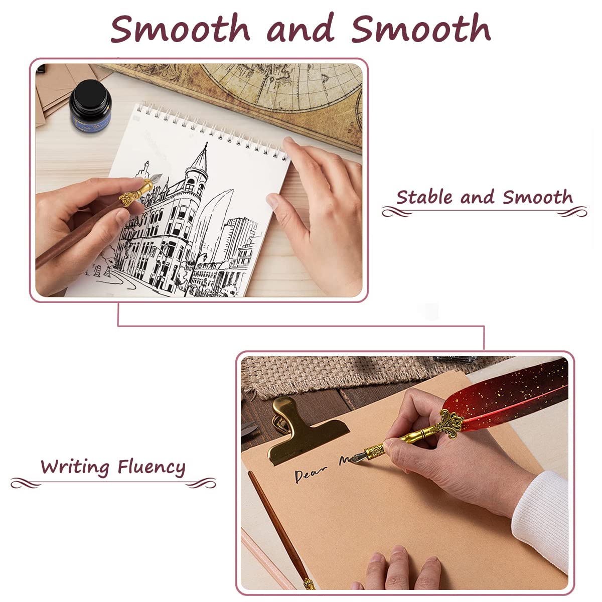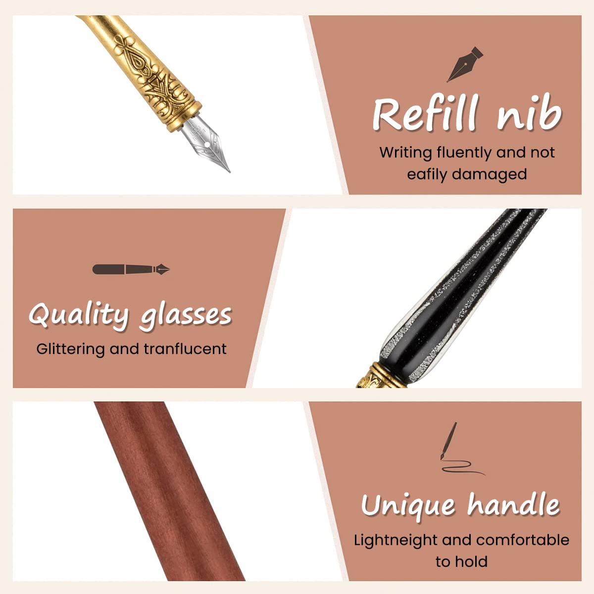 - EXCELLENT QUALITY AND CRAFT: All product is made of quality material. The nib is made of stainless steel and delivers smooth and clear writing. Including 1 quill pen, 1 wooden pen, and 1 glass pen, full of vintage touch and style. Coming with 18 replacing nibs and 6 color ink, premium ink is without streaks, lines, stains, and no ink leakage.