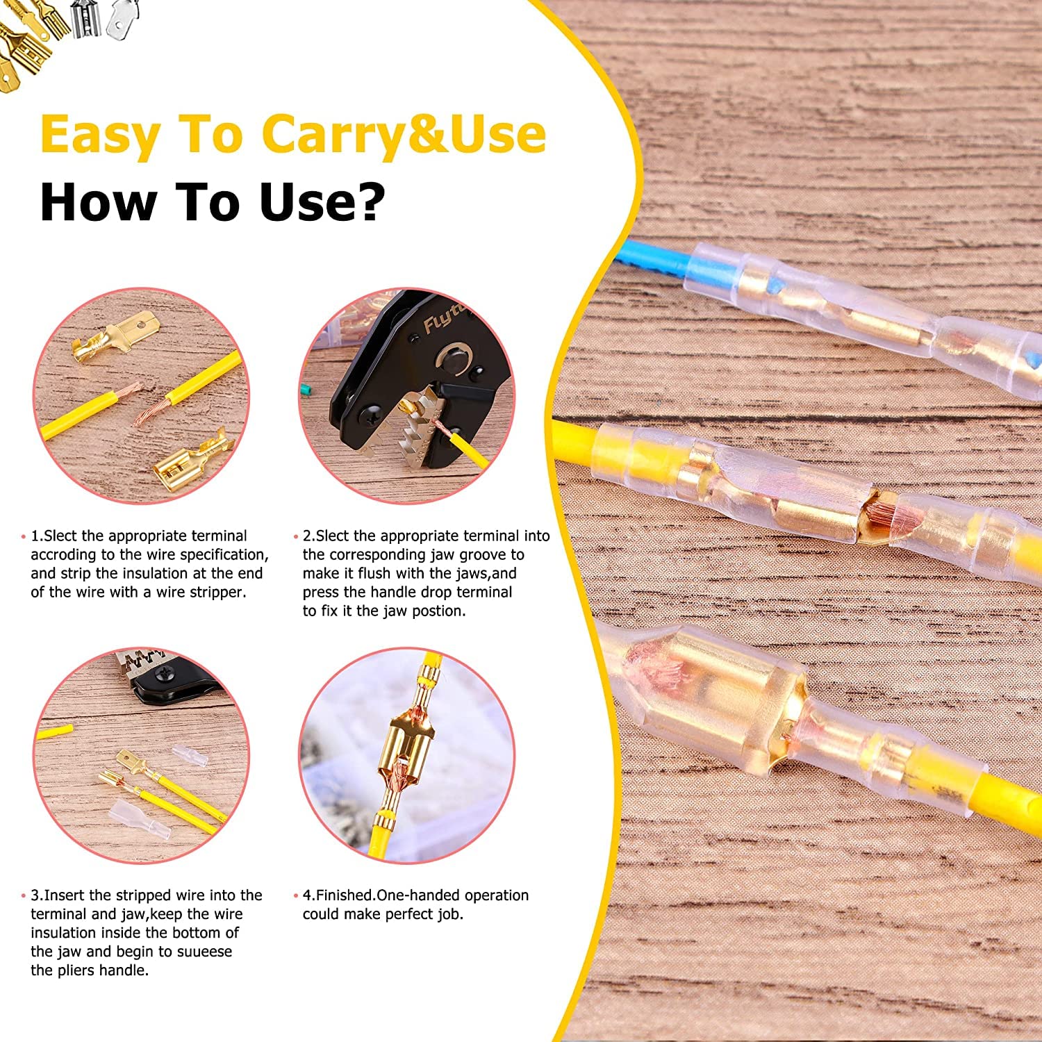 - WIDE APPLICATION: The combination of crimping tool and spade connectors can be widely used to home appliances, auto, audio system for battery or rocker switch quick connecting / disconnecting, motorcycle, scooter, auto, car, truck, boat etc.