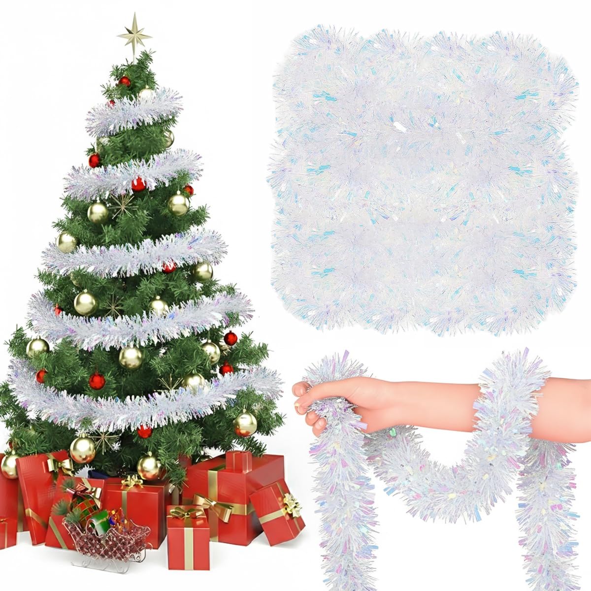 - HASTHIP Christmas Tinsel Garland for Holiday Decor with 16.4ft Metallic Shine White HASTHIP Christmas Tinsel Garland for Holiday Decor with 16.4ft Metallic Shine White