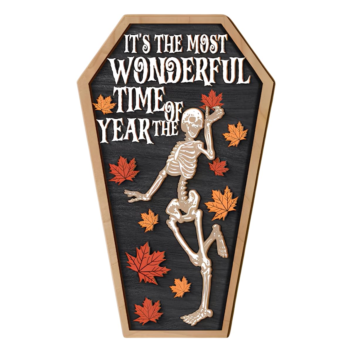 The HASTHIP Halloween Desk Decor Wooden Skeleton Printed Coffin Panel Decorative Wall Decor adds a festive touch to seasonal celebrations with its playful skeleton design and autumn-inspired details. Crafted from sturdy wood, this durable coffin panel showcases gothic-style lettering that reads "It is the most wonderful time of the year," enhancing its eerie yet cheerful charm. Measuring approximately 6.3 x 11.8 cm, it easily fits on desks, bookshelves, or walls, offering versatility for any Halloween arrangement. The vivid printed design and rustic texture create a cozy, spooky atmosphere ideal for parties or home decorating. HASTHIP combines quality craftsmanship with creative design to deliver reliable and lasting Halloween decor.