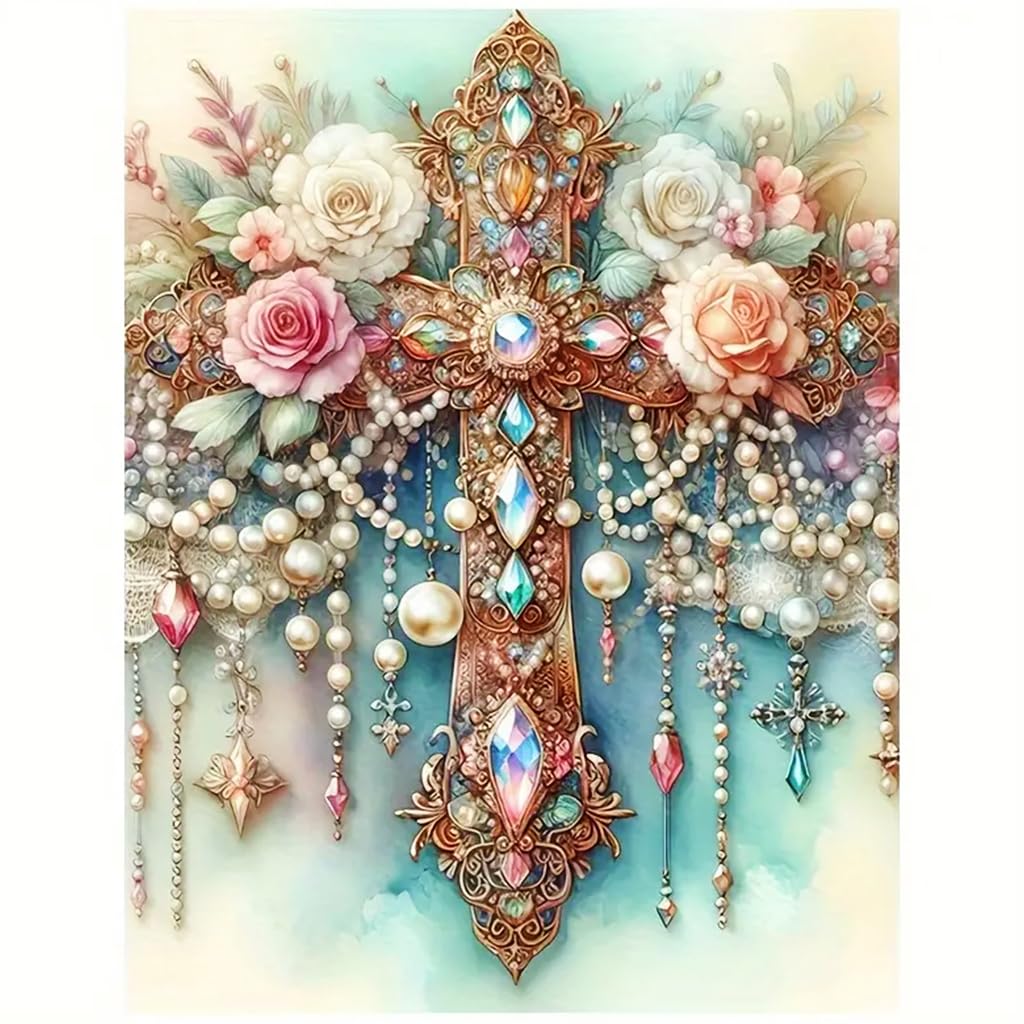 HASTHIP Diamond Art Painting Kit for Home Decor with Tools and Canvas 11.8x15.7 in | DIY Rose Cross Design