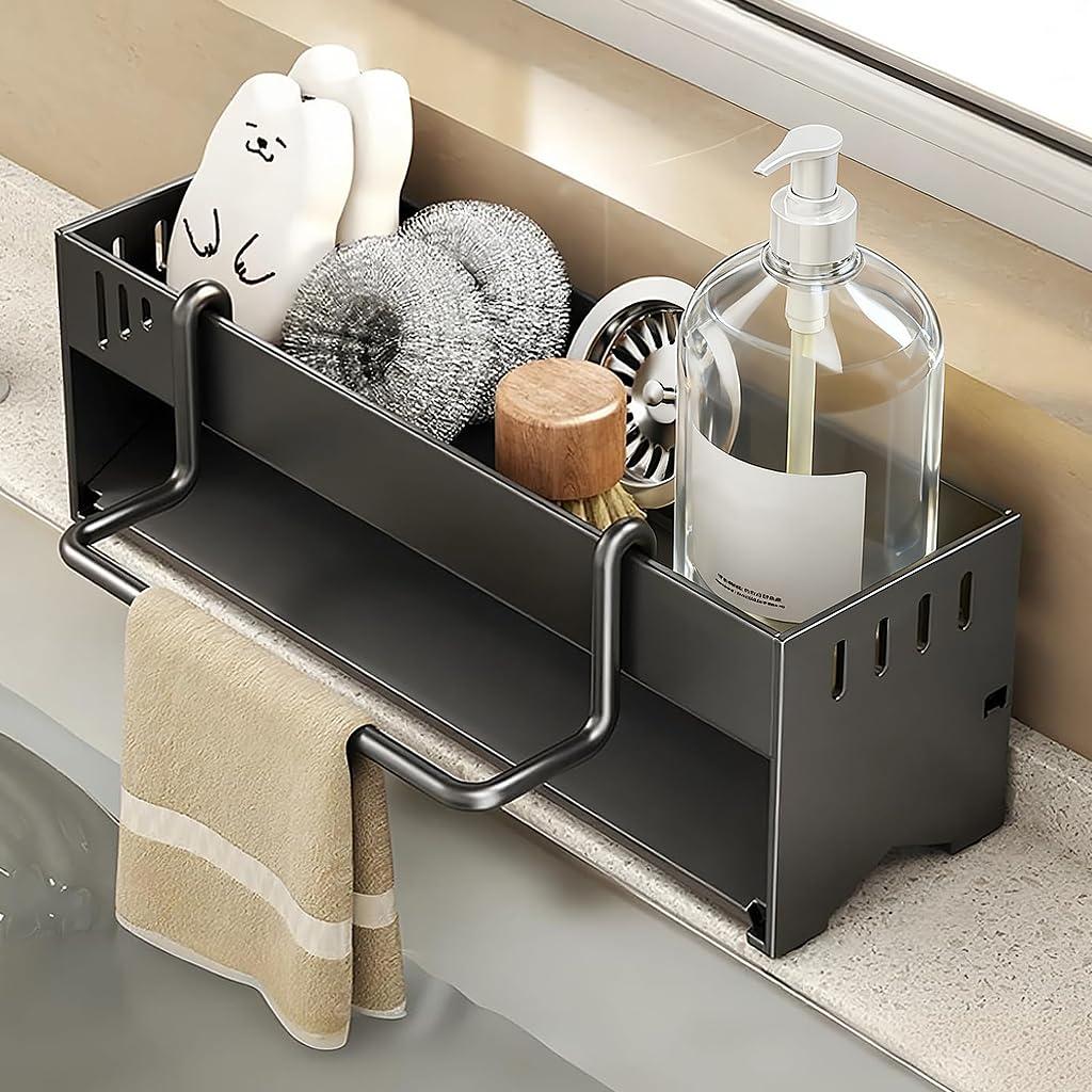 - HASTHIP Metal Sponge Holder for Kitchen Sink with Water Guiding Panel & Towel Bar | 30.5x9.6x9 cm Stainless Steel Organizer HASTHIP Metal Sponge Holder for Kitchen Sink with Water Guiding Panel & Towel Bar | 30.5x9.6x9 cm Stainless Steel Organizer