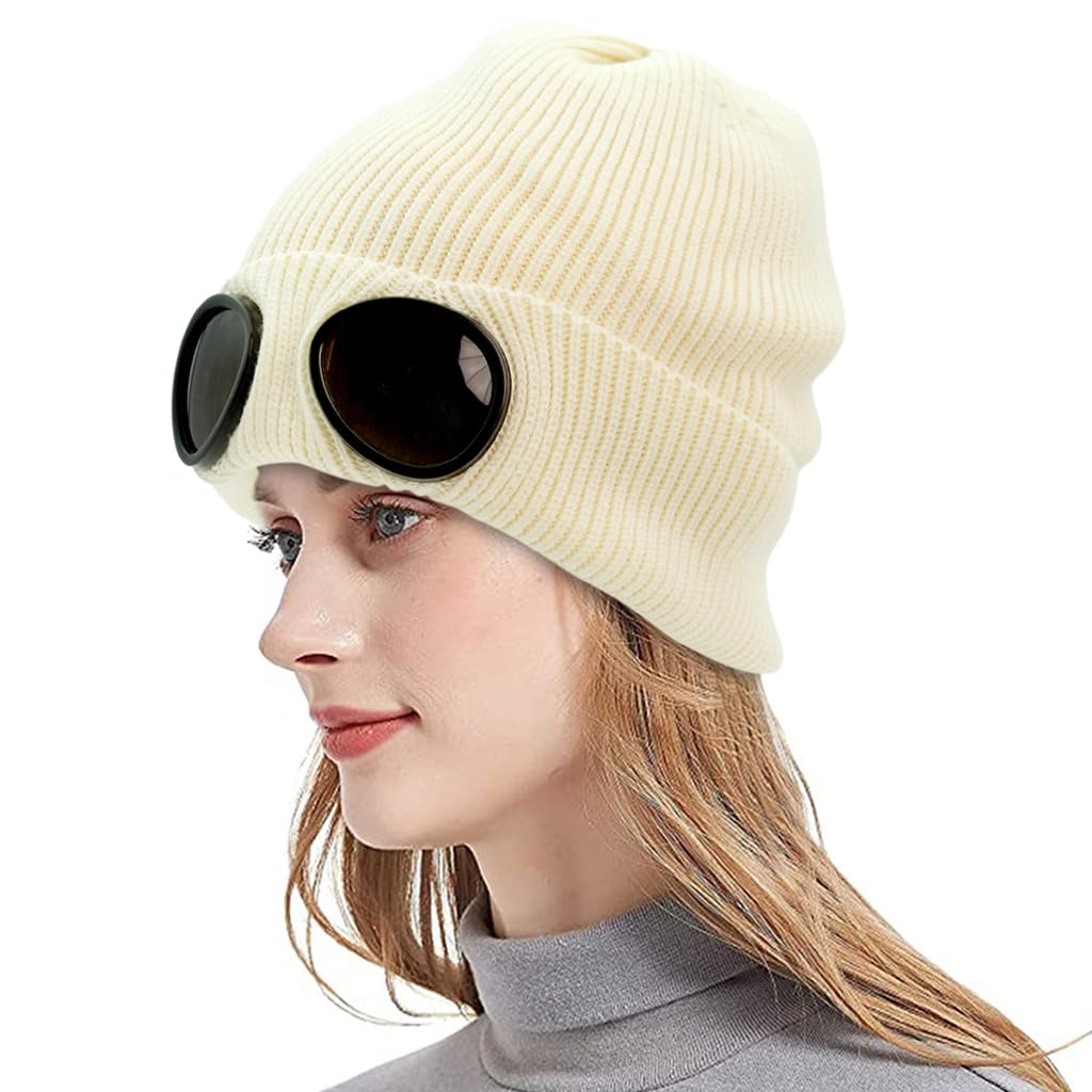- PALAY Knitted Beanie Hat for Winter Warmth with Built In Goggles in Beige | Unisex Style PALAY Knitted Beanie Hat for Winter Warmth with Built In Goggles in Beige | Unisex Style