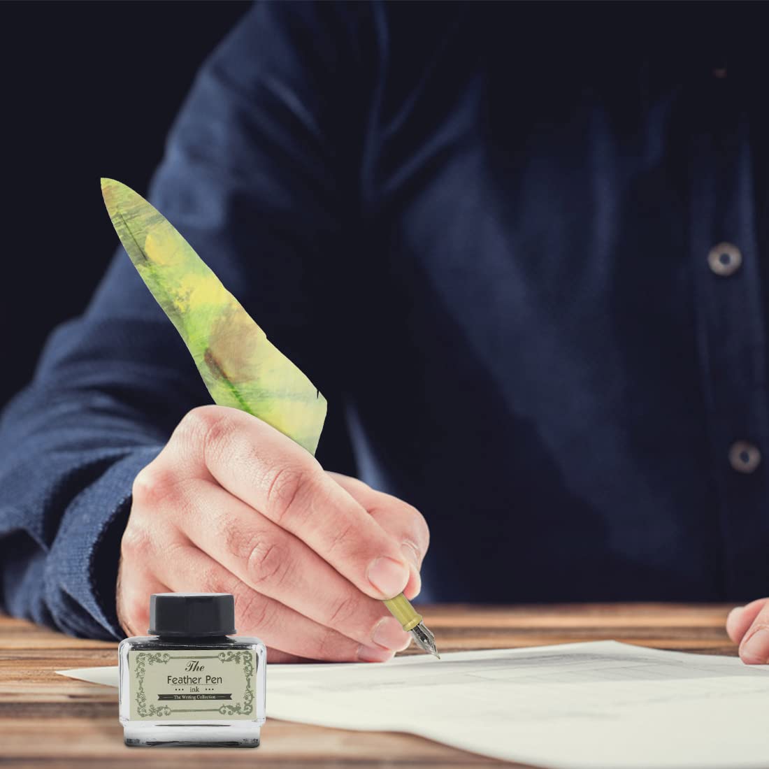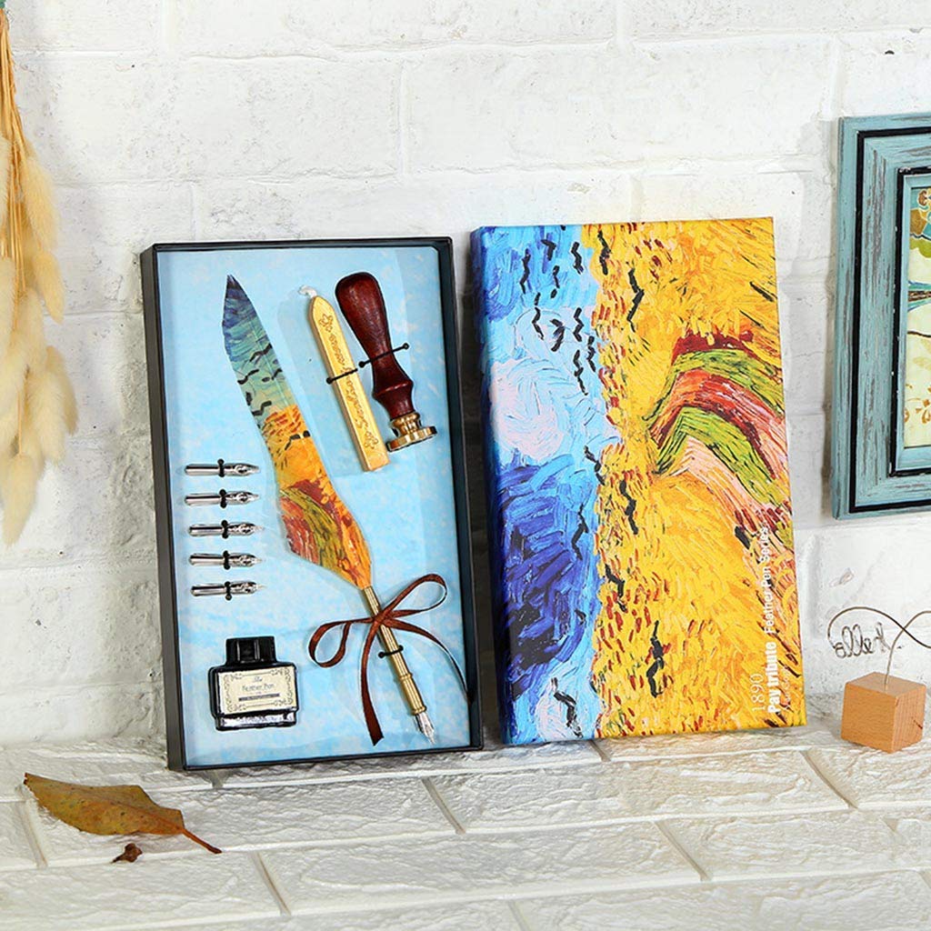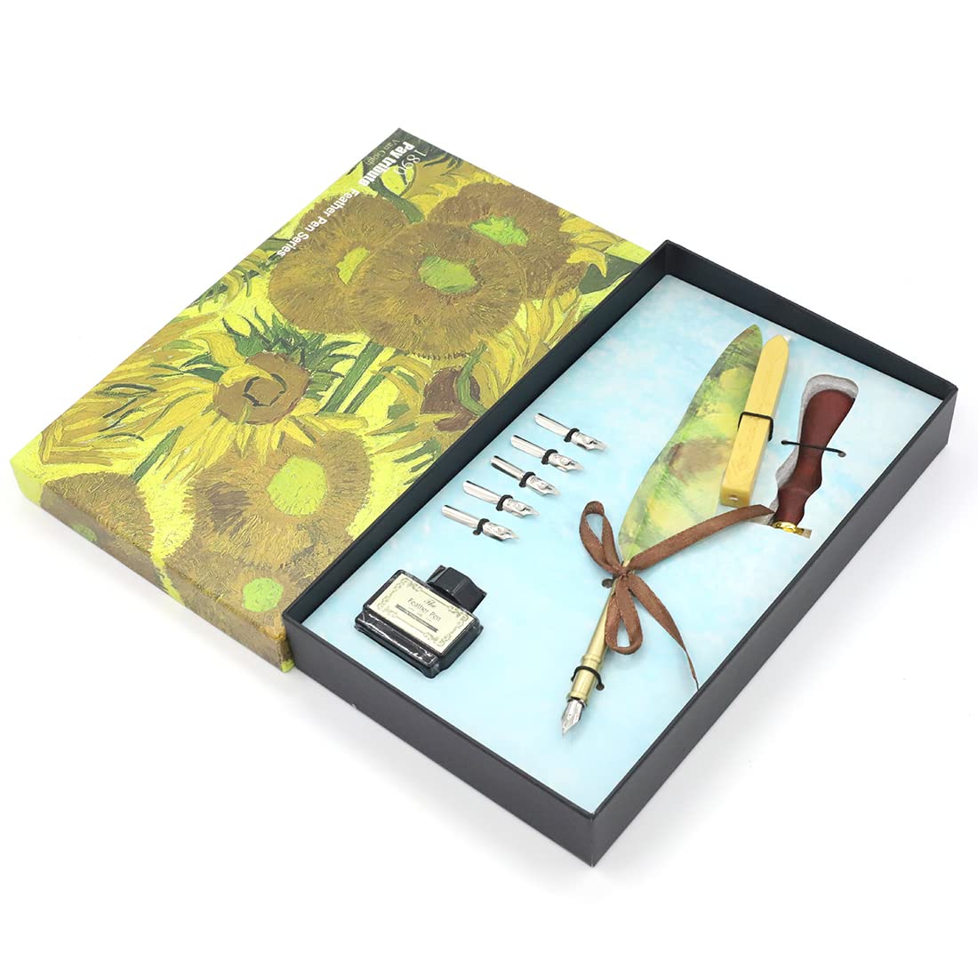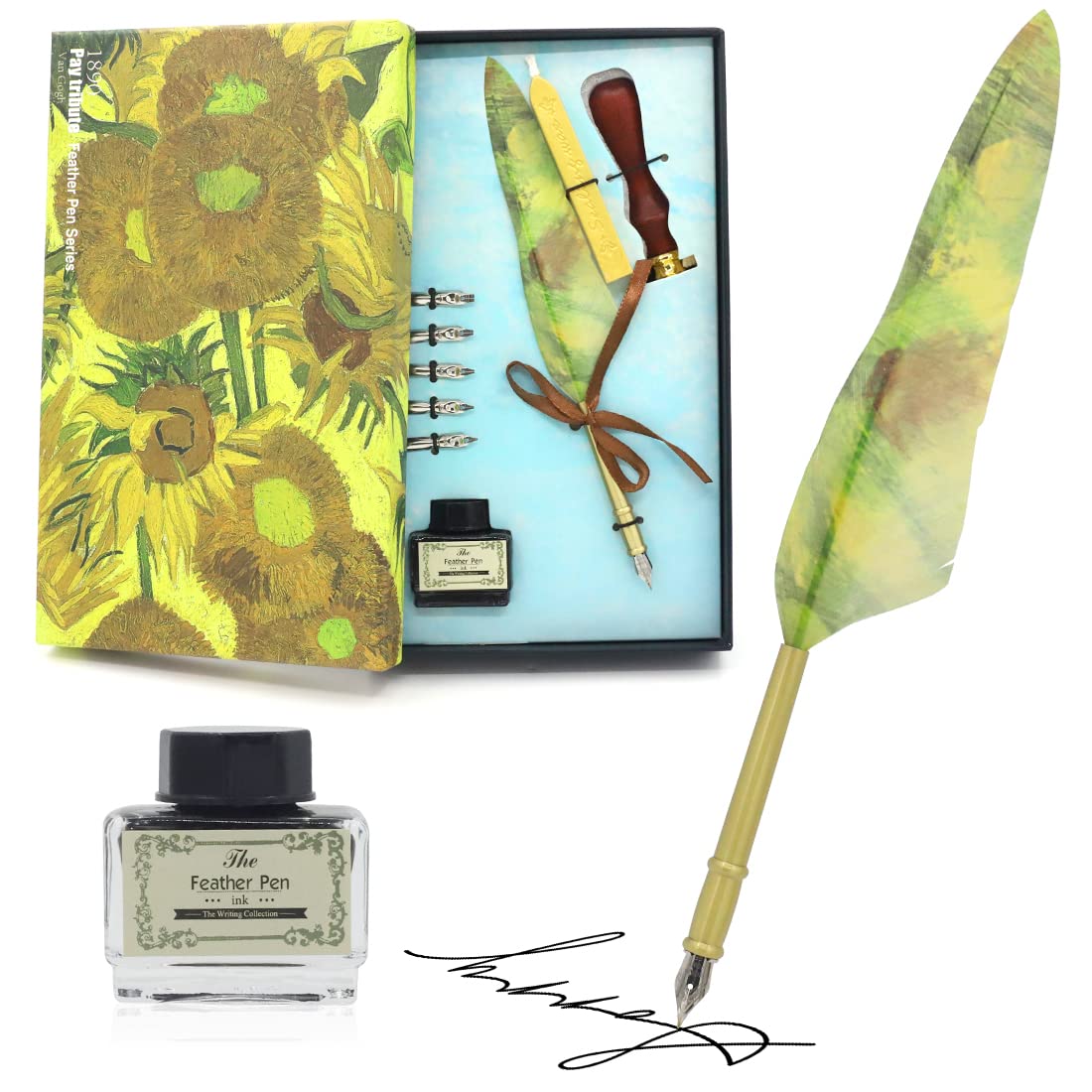 HASTHIP Quill Pen Ink Wax Seal Stamp Gift Set, Feather Pen Ink Set Includes Feather Dip Pen,15ml Ink, 5 Replacement Nibs, 1 Paint Seal, 1 Paint Wax Valentine Gift (Sunflower)