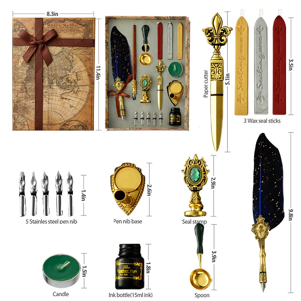 - Wax Seal Stamp Kit]--Except the vintage quill pen ink, there is also a full set of wax seal set,including three different color wax stick, melting spoon, tea light candle, one seal stamp. Full set wax seal tools for letter seal or invitation,etc. Feather pen and ink set has 5 different size replacement nibs made from premium metal, you can replace the nibs as your writing needs.