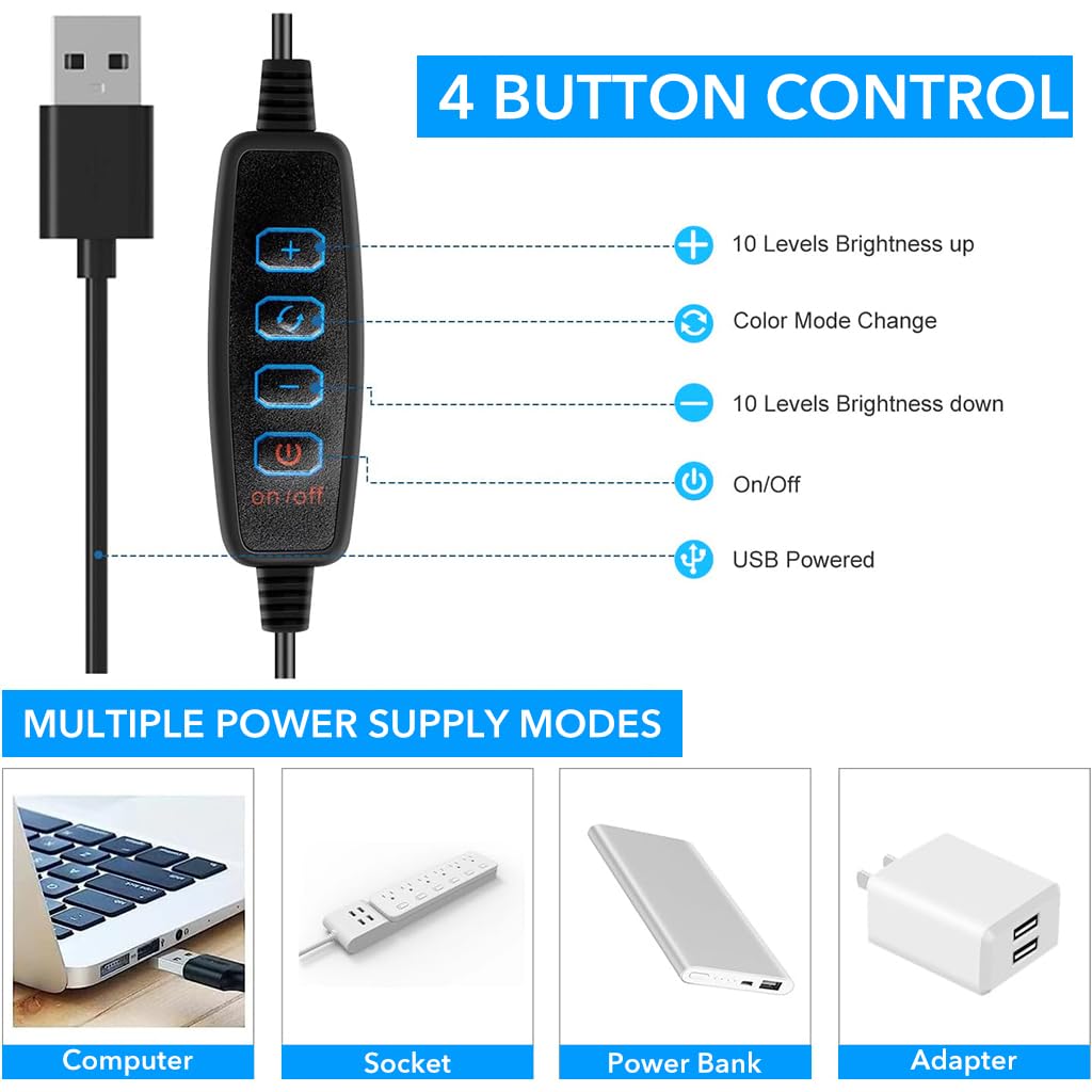 - SIMPLE AND CONVENIENT USB POWER SOLUTION: Power up with ease using the USB plug-and-play feature, compatible with power banks and standard adapters. A separate controller adds convenience, providing quick access to all settings. This setup is perfect for students, professionals, or anyone on the go who needs reliable and hassle-free lighting anytime, anywhere.