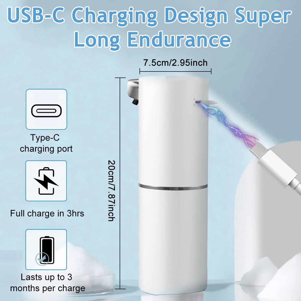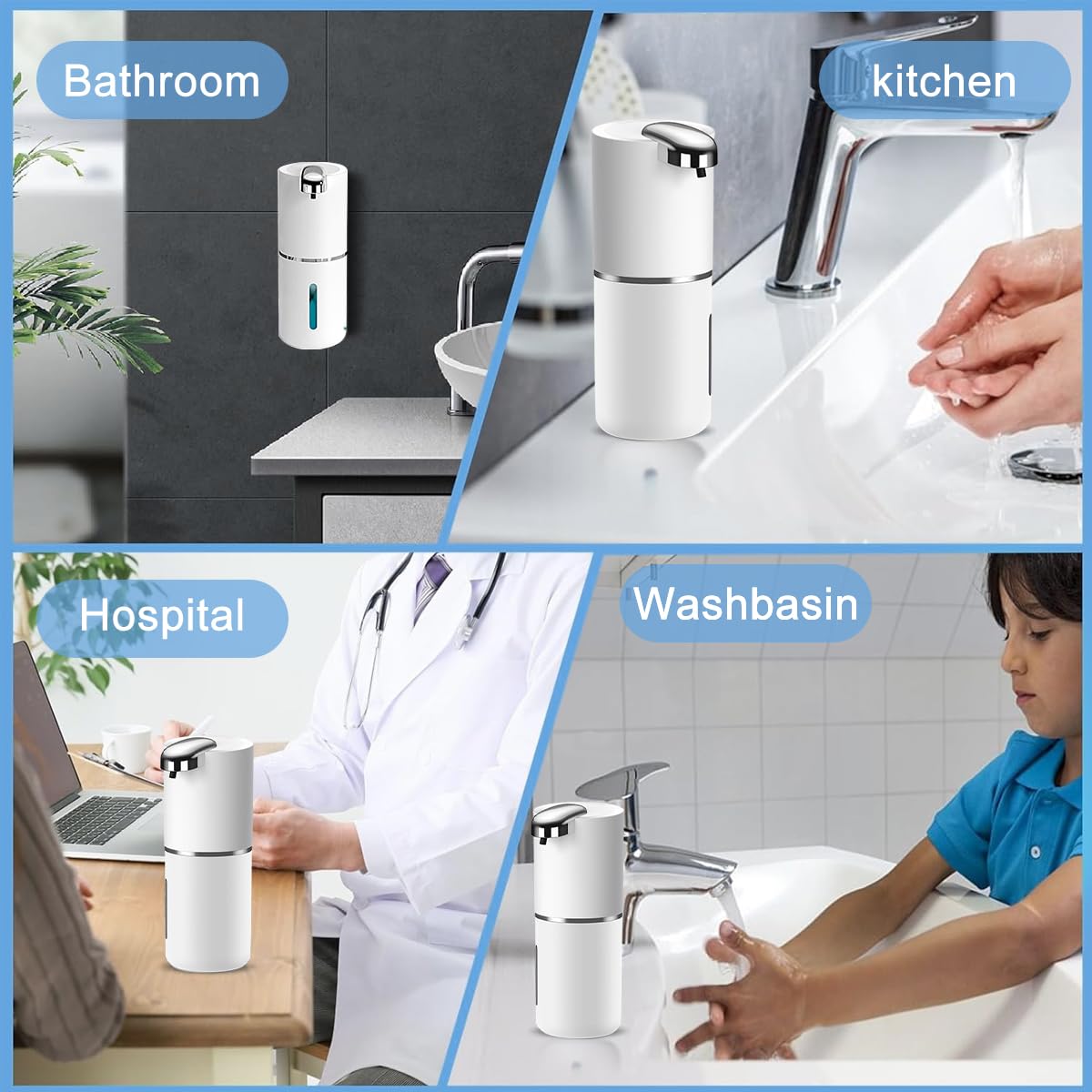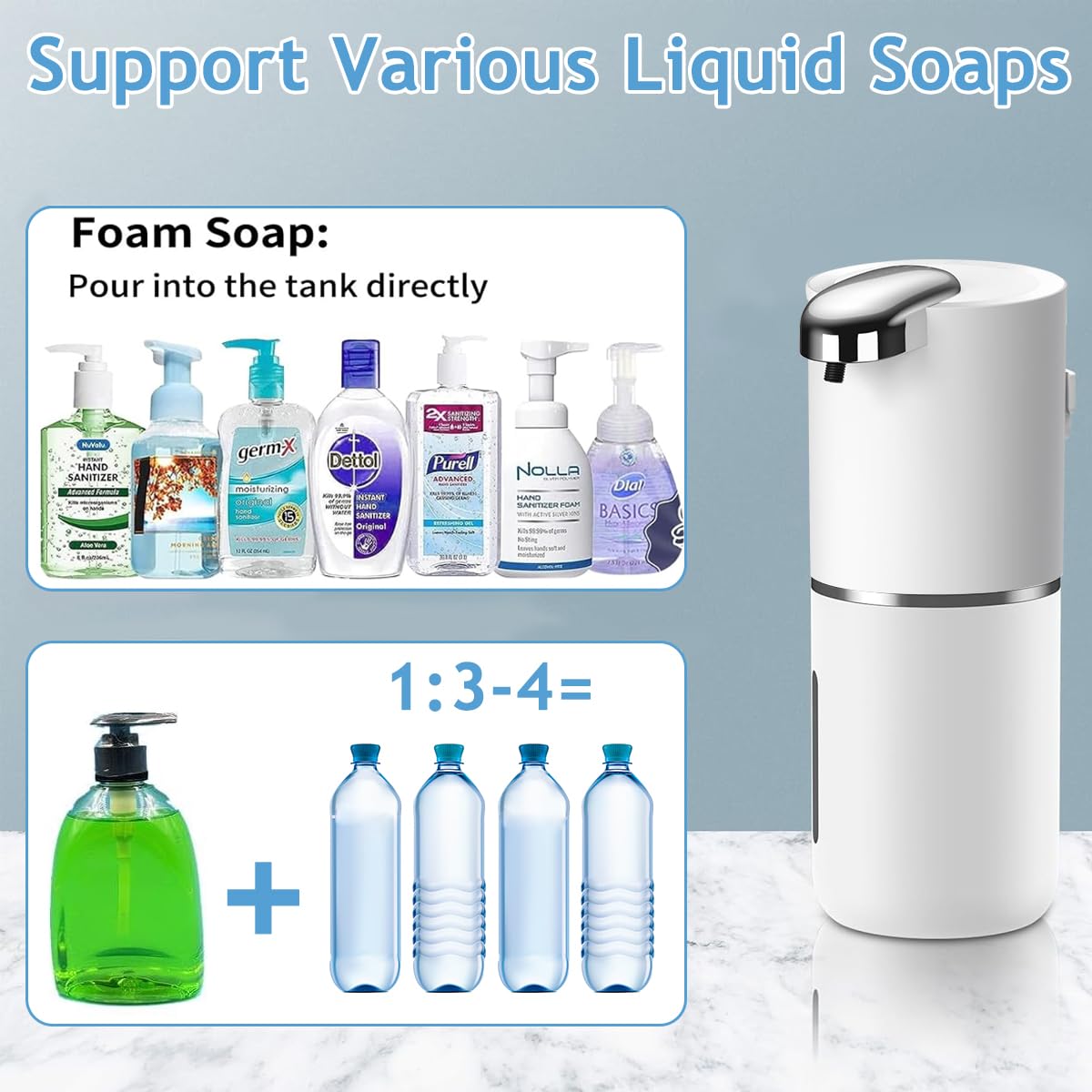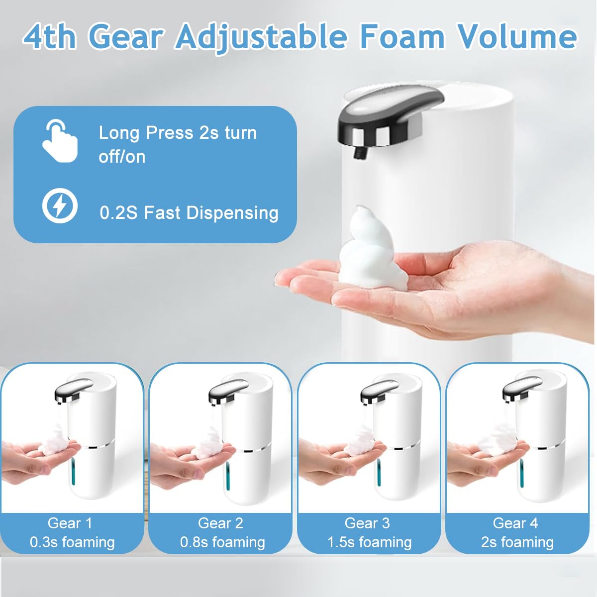 - AUTO SOAP FOAMER DISPENSER: No-touch soap dispenser for home, office, this sleek soap dispenser applies latest motion sensor technology can precisely detect people's hands below the nozzle and dispenses the desired amount of soap on people's hand. This soap foam dispenser can dispenses fine and rich soap foam in your hands, suitable for vairous product including face cleanser, hand wash soap, shampoo, etc, bringing you a more healthy and convenient life style