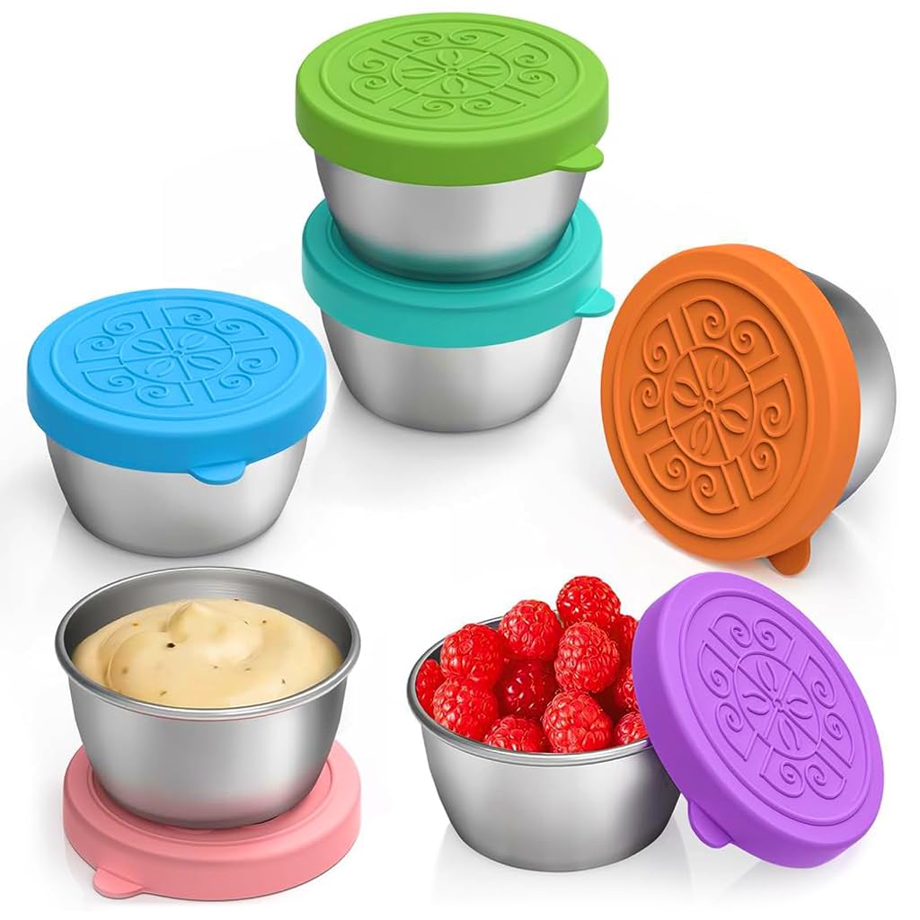 - LEAK-PROOF SILICONE LIDS: The colorful silicone lids are designed to be completely leak-proof, ensuring that your sauces or dressings stay in place without any messy spills. this feature makes them ideal for lunch boxes or picnics, providing a mess-free dining experience wherever you go.