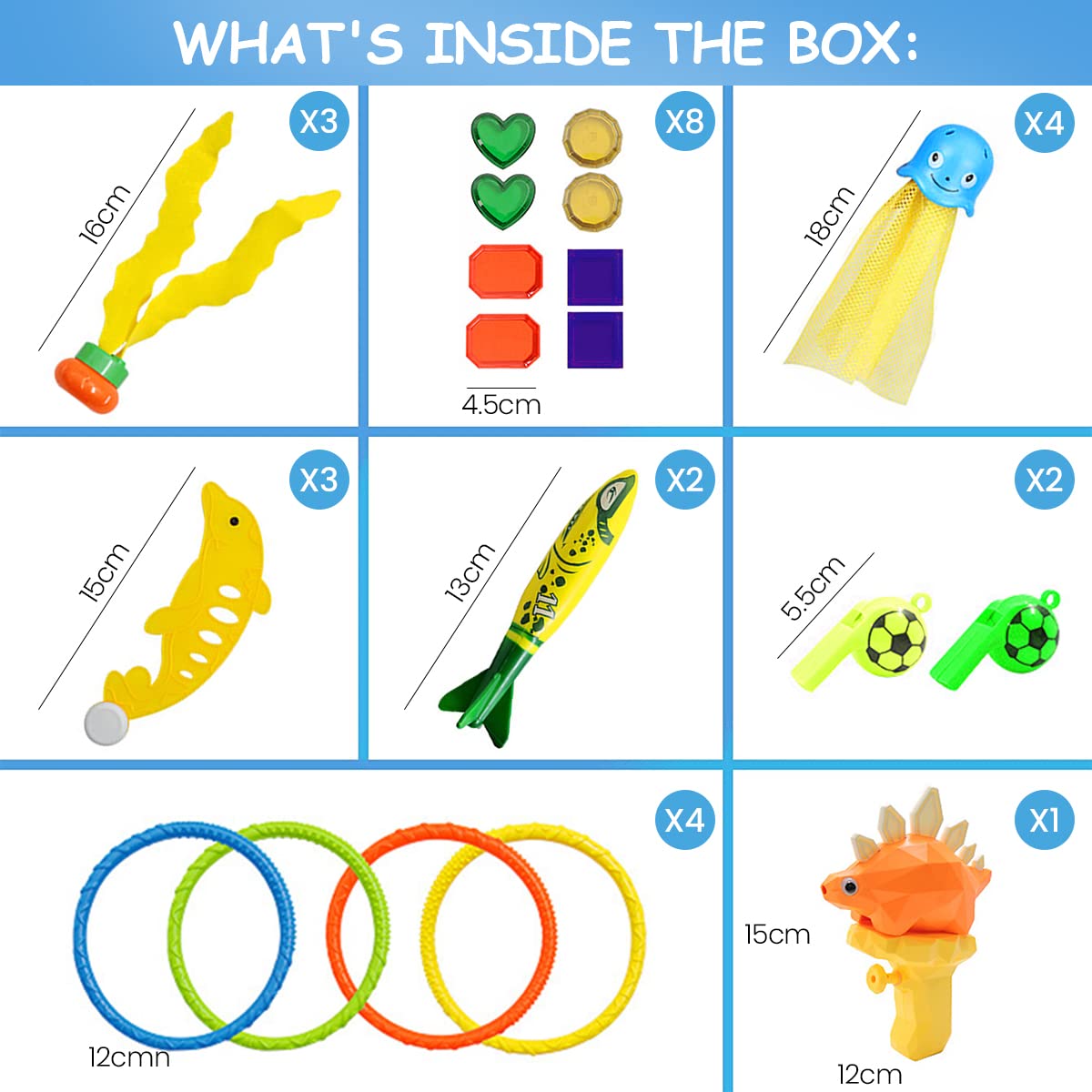 - GRAT VALUE PACK: Including total 27pcs, 4 Diving Rings, 8 Pirate Treasures, 3 Toypedo Bandits, 5 Fish Toys, 4 Octopus Toys, 1 Water Spray Gun, great affordable toy set bringing more fun for the whole Summer