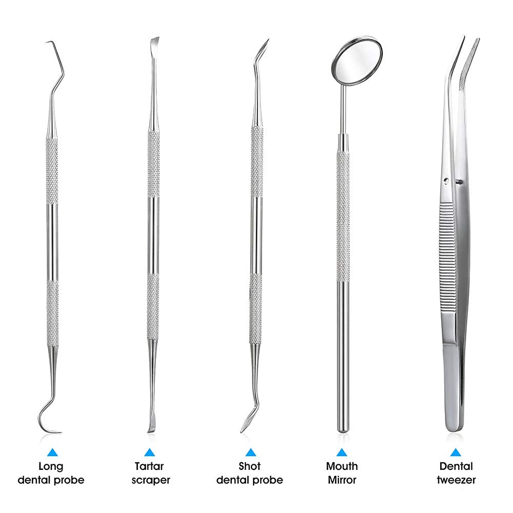- 5 in 1 Multifunctional Dental Care Products: This 5 pcs unique daily care hygiene toolset is designed in different angles and shapes including 3 Dental Probes, 1 Dental Tweezer & 1 Dental Mouth Mirror with Box. These dental tools are easy to solve oral health problems as good for removing oral stains, food debris, freshening breath, whitening teeth, observing some hard-to-see areas. You can also use this professional teeth scraper kit to keep your pet's teeth clean and refresh.