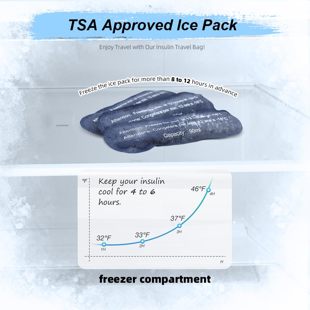 - TSA CERTIFIED ICE PACK FOR TRAVEL FREEDOM: Air travel is made simple with our TSA approved ice pack, ensuring hassle-free journeys with your diabetic supplies. For optimal performance, freeze the ice pack for 8-12 hours before use, and travel with confidence knowing your insulin is safely cooled. The Compact Insulin Cooling Bag Traveling make your travel safety