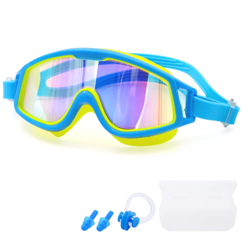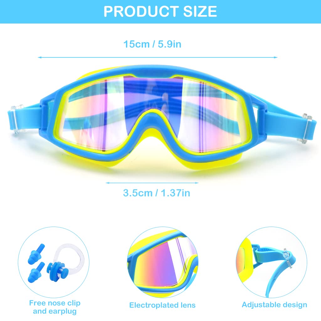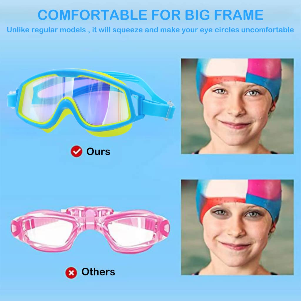 - ANTI-FOG & NO LEAKING & UV PROTECTION: Professional kids swimming goggle is using HD lens with anti-fog coating and UV protection mirror coating providing kids a clear visual under the water no matter for indoor swimming or outdoor swimming . Great leakingproof performance thanks to the silicone frame preventing any water get inside of the goggle, protects kids' safety in water.