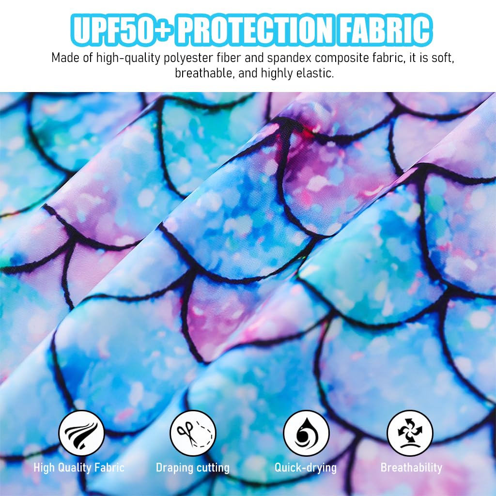 - LOVELY MERMAID SWIMMING SUIT FOR GIRLS: One-piece girls mermaid print swimming suit, long sleeve style swimming suit for various water activities. Unique UPF 50+ fabric gives your girl a safe skin protection under blazing sun, allowing your girl can enjoy the sun and water happily. Size : length: 49cm, chest: 63cm; sleeve length: 45.5cm; leg: 30.4cm; recommended height: 116-122cm; recommended weight: 22-26kg