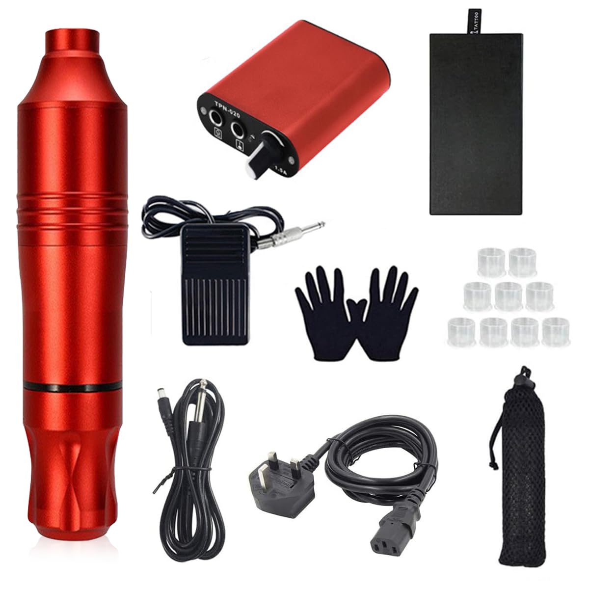 - Comprehensive kit includes rotary pen, connection cords, needles, ink cups, foot pedal, gloves, and storage bag.