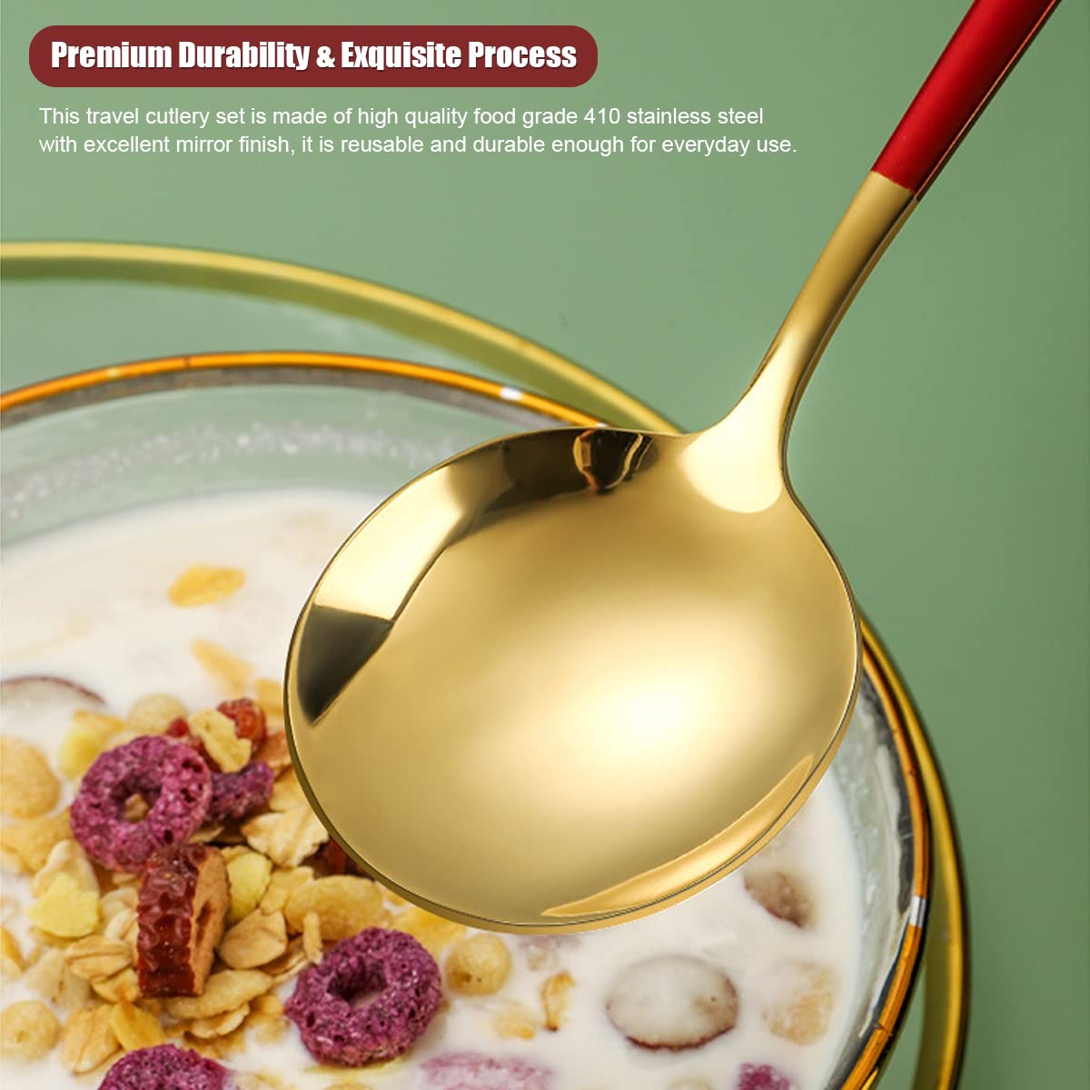 - [Premium Durability & Exquisite Process]--This travel dining utensils set is made of by premium food grade 410 stainless steel with great mirrioring process,reusable and durable for daily use. Easy to clean, the dishwasher safe.