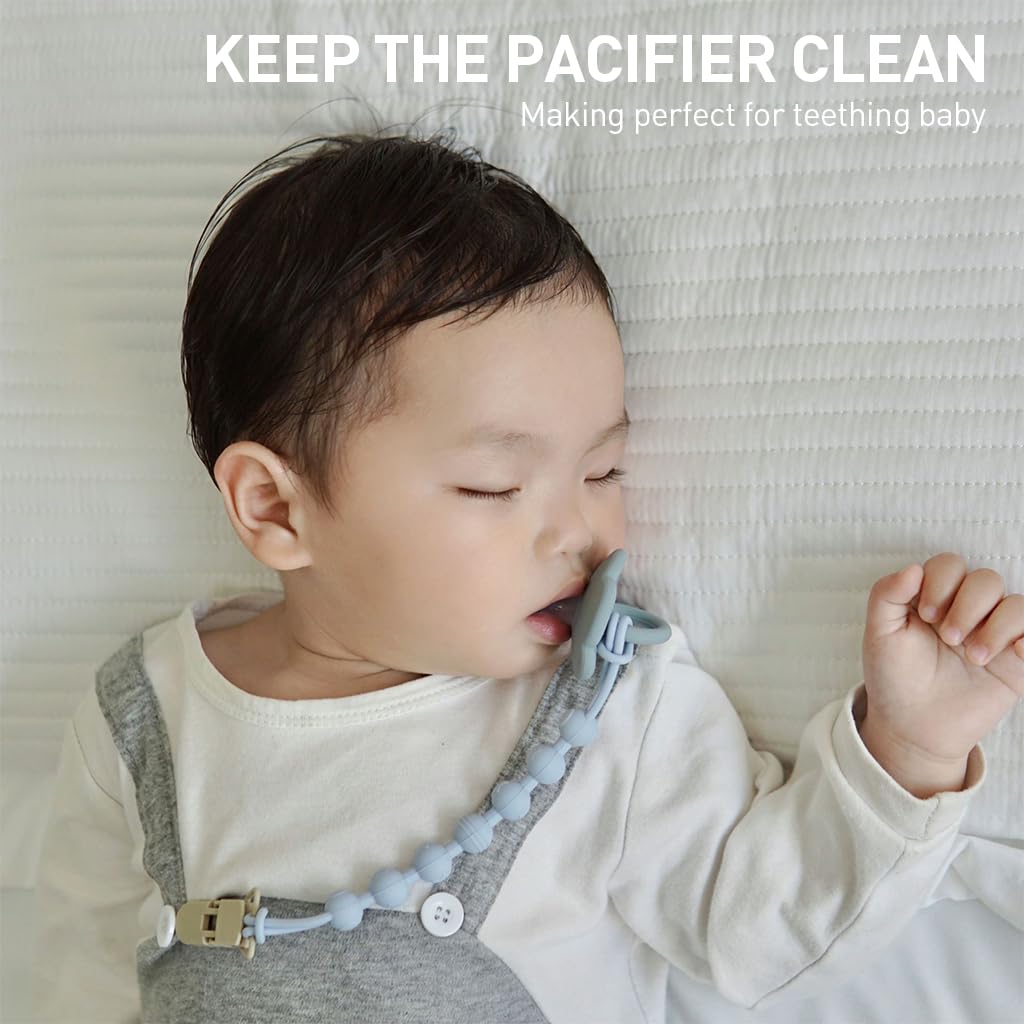 - KEEP THE PACIFIER SAFE: Keep the pacifier close to your baby always with the dual functional pacifier clip chain. Designed with both functionality and style in mind, these clips not only keep pacifiers within easy reach but also prevent them from falling to the ground and getting lost or dirty. The soft, chewable beads are made from high-quality, BPA-free silicone, ensuring they are safe for babies to gnaw on and soothe their teething gums.