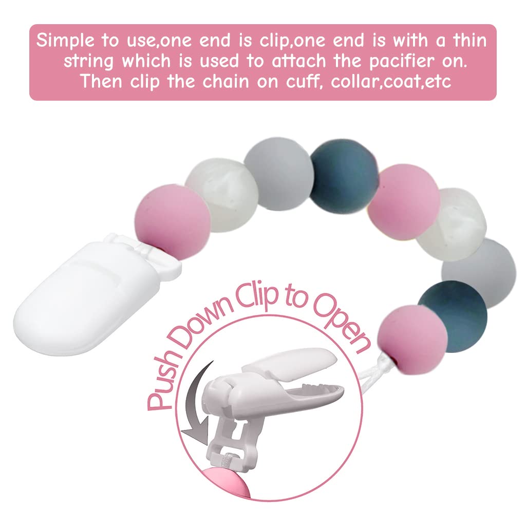 - EASY TO USE: Simple to use, one end is clip, one end is with a thin string which is used to attach the pacifier on(pacifier with handle is recommended). Then clip the chain on cuff, collar, coat, etc, anywhere, very convenient to use .