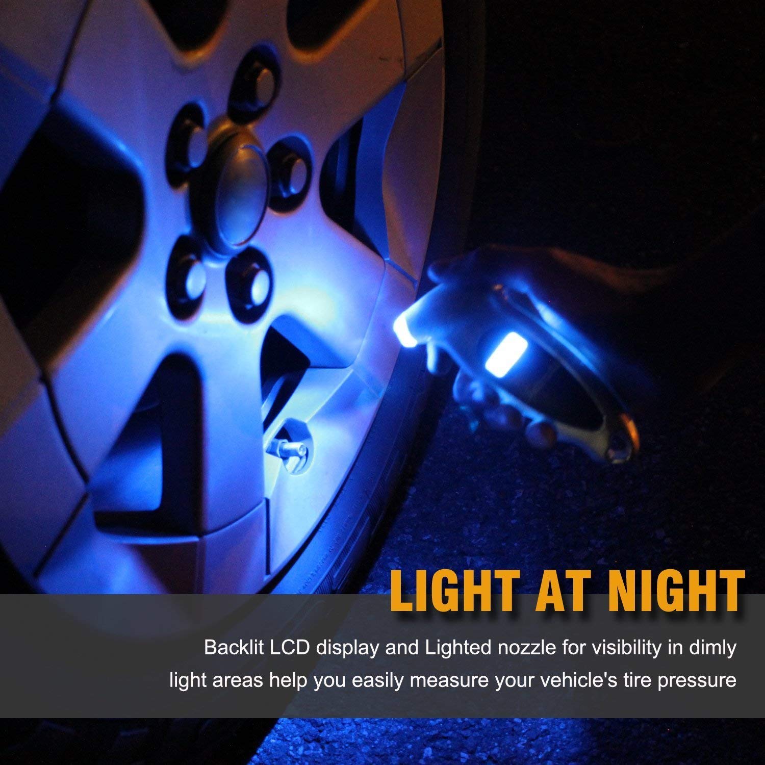 - Caring LCD Backlit]: With the backlit LCD display and illuminated nozzle, the digital tire pressure gauge is visible in dimly light areas or corner