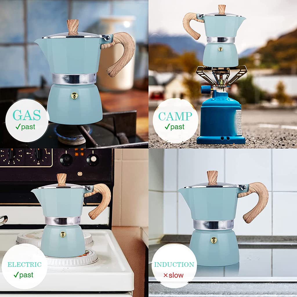 - ENJOY TRADITIONAL BREWING COFFEE: Using stove top coffee pot is a traditional and authentic way of making Italian and Cuban style coffee, which cna better extract the taste and flavor of ground coffee, Also is a coffee art . You can brew coffee exactly to your preferences. Light lake blue coating with wooden handle adds more touch.