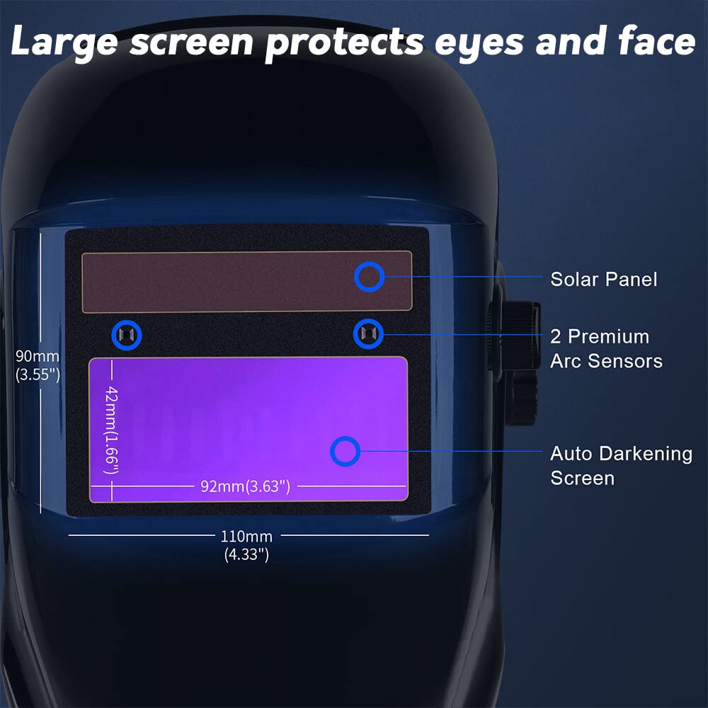 - [Auto Darken Welding Helmet ]--Upgrade solar powered auto darkening welding helmet, applying premium darkening lens, clear visibility with outstanding high frenquency light probe,providing a reliable protection for youduring welding job.Full cover design also can protect head from welding dust, flying welding scum.