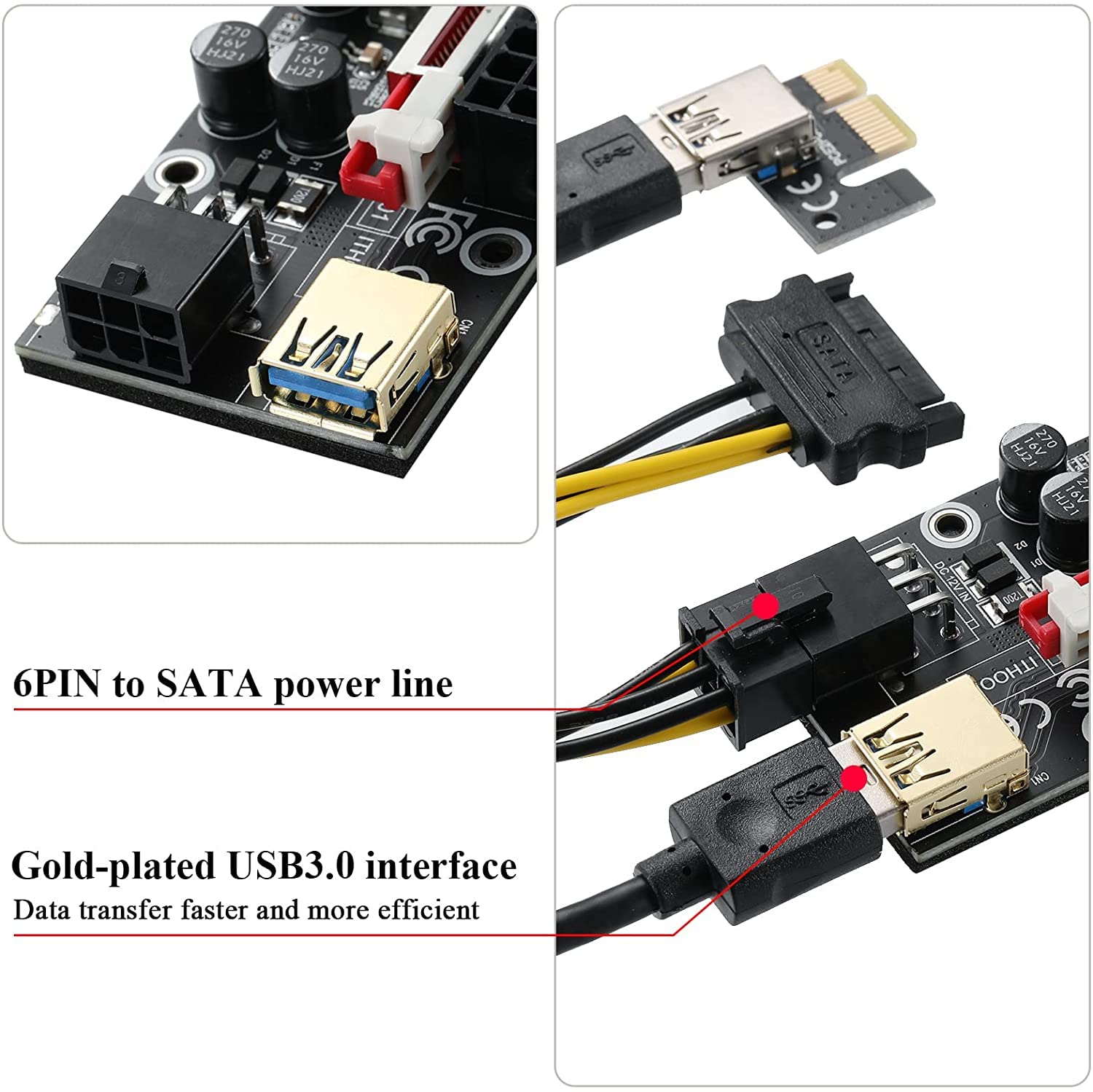- Longer Durability]: This mining PCIE riser has USB cable, the cable with shielded net inside is more stable for mining, PCI-E riser 1x to 16x power supply adapter card with multi-layer shielded cable will not weaken the signal. And the PCI-E link bit is gold-plated, which is wear-resistant and more conducive and stable; And designed with fixed buckle and LED indicator light.