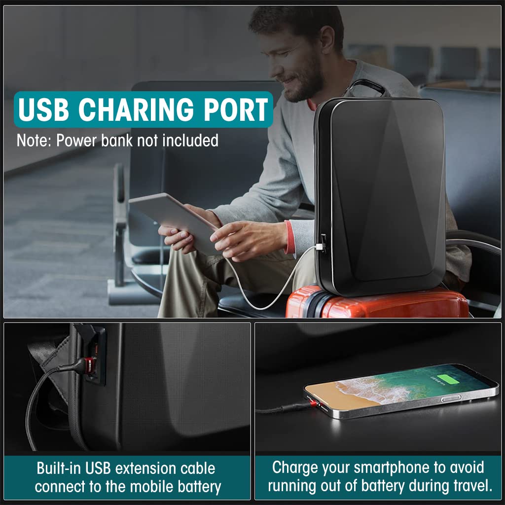 - UPGRADE USB CHARGING PORT: This multifunctional fashionable laptop backpack features exterior USB charge port, built-in charge cable and the power bank pouch (power bank not included). In addition, you need another data cable to connect to your phone to charge. Then you can enjoy using your any electical devices whiling charging anytime anywhere. This waterproof backpacks for men considers your various needs for daily use. Enhanced security performance and well organized inner construction.