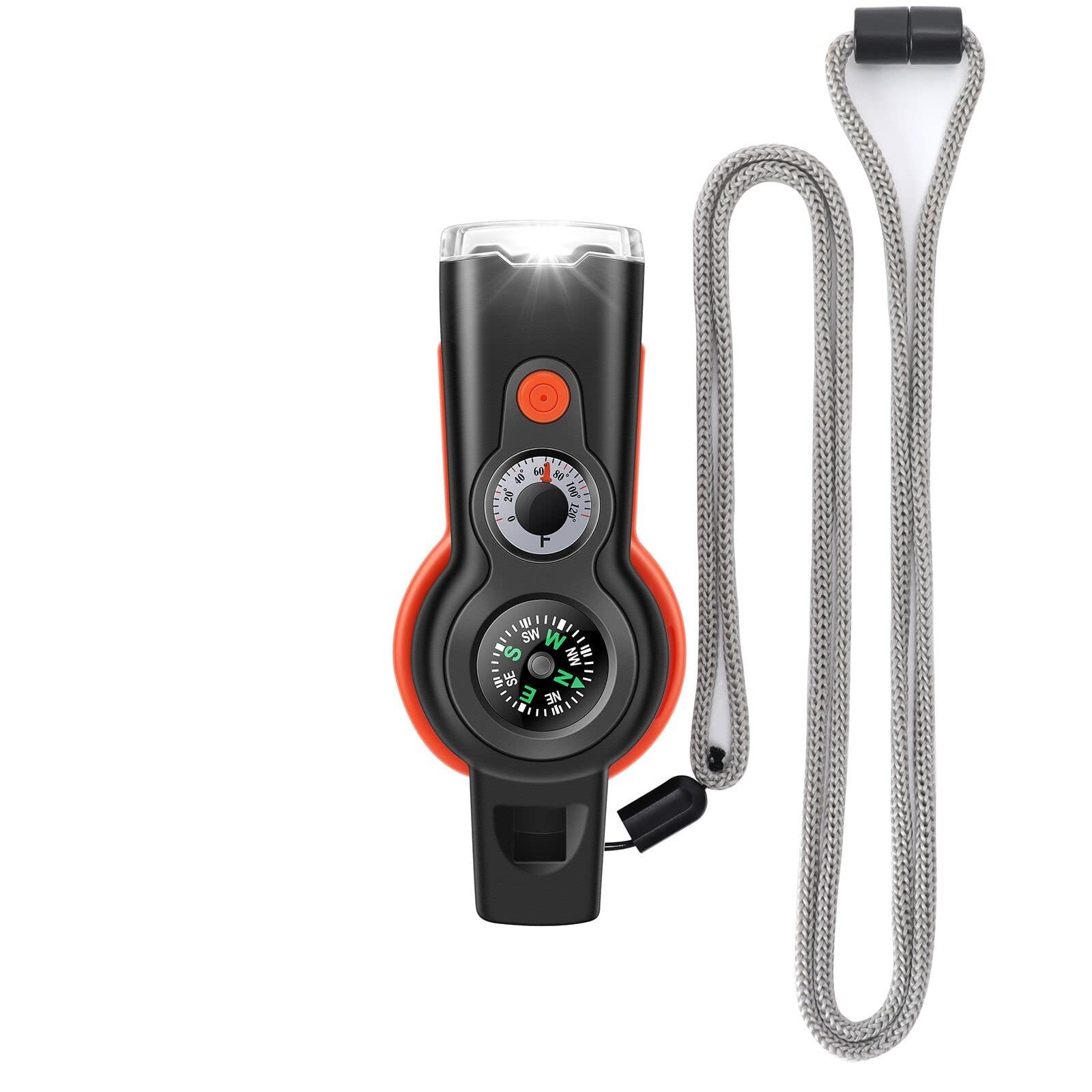 - 7 IN 1 OUTDOOR SURVIVAL WHISTLE: Practical functional whistle combines the whistle, LED light, themometer, compass, reflective mirror, magnifying glass and additional storage space, a handy and practical addition for your outdoor equippment.