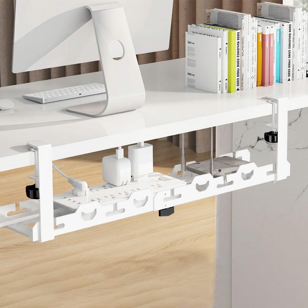 Climberty White Cable Management Under Desk helps organize and conceal cords efficiently in any workspace. Featuring an adjustable metal structure that extends from 15.7 to 29 inches, it provides flexibility to fit different desk sizes while maintaining durability through high-quality carbon steel construction. The no-drill installation with an adjustable screw-fixing mechanism ensures secure attachment without damaging your furniture. Designed with multiple open slots, it allows separated and tangle-free cable placement for easy access. This versatile under-desk organizer also accommodates power strips and small office items, promoting a neat, clutter-free, and functional environment that reflects Climberty’s reliable approach to workspace organization.