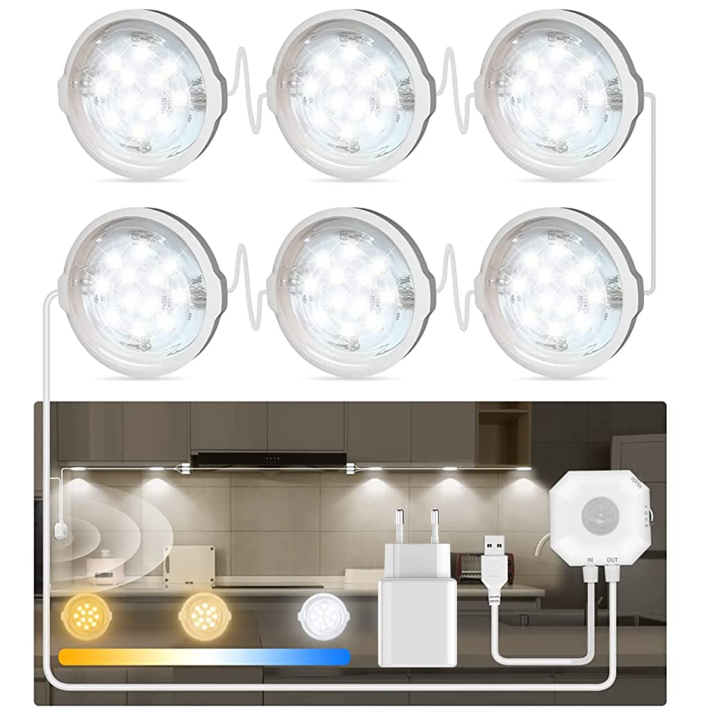 ELEPHANTBOAT Under Cabinet Light for Kitchen and Closet with 6 Round LEDs and Motion Sensor | Dual Color USB Plug and Play