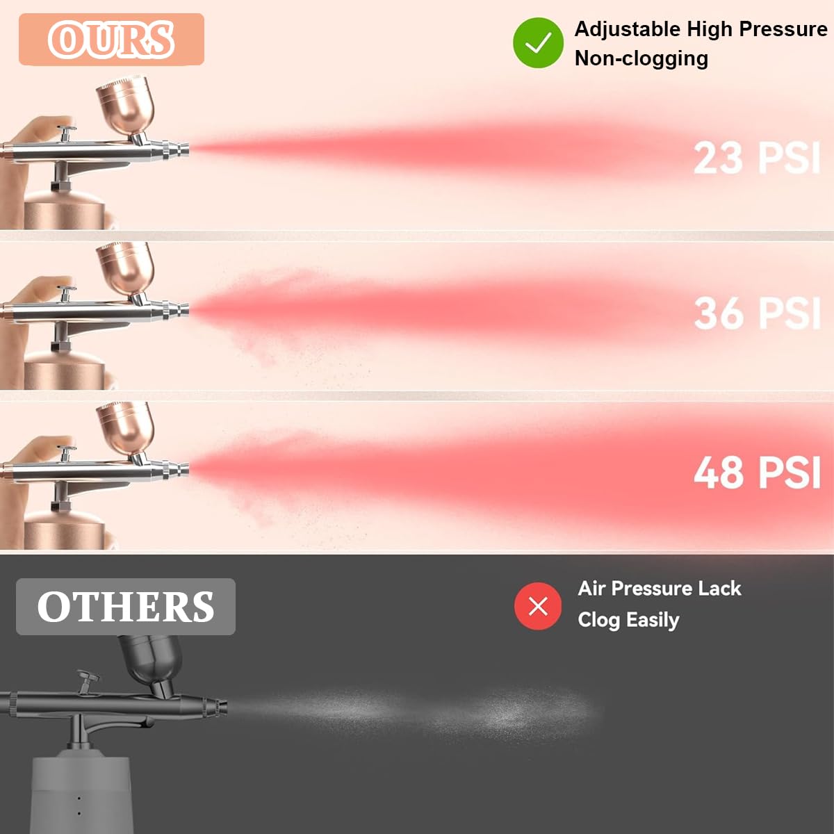 - ADJUSTABLE 3-GEAR AIR PRESSURE: Our upgraded airbrush offers enhanced air pressure adjustment settings, giving you 3 air pressure options (23psi, 36psi, and 48psi) over your artwork, you can achieve the desired effect effortlessly. Unlike ordinary spray guns, our airbrush will not clog during use, making it perfect for various applications such as model painting, graffiti, manicures, makeup, barber, cake decor, and tattoos.